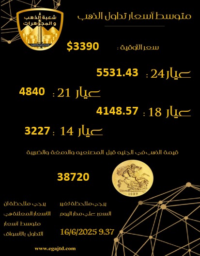 تراجع سعر الذهب خلال ختام تعاملات اليوم الاثنين 16 يونيو 2025، بنحو 10 جنيهات عن آخر تحديث له منذ ساعتين.