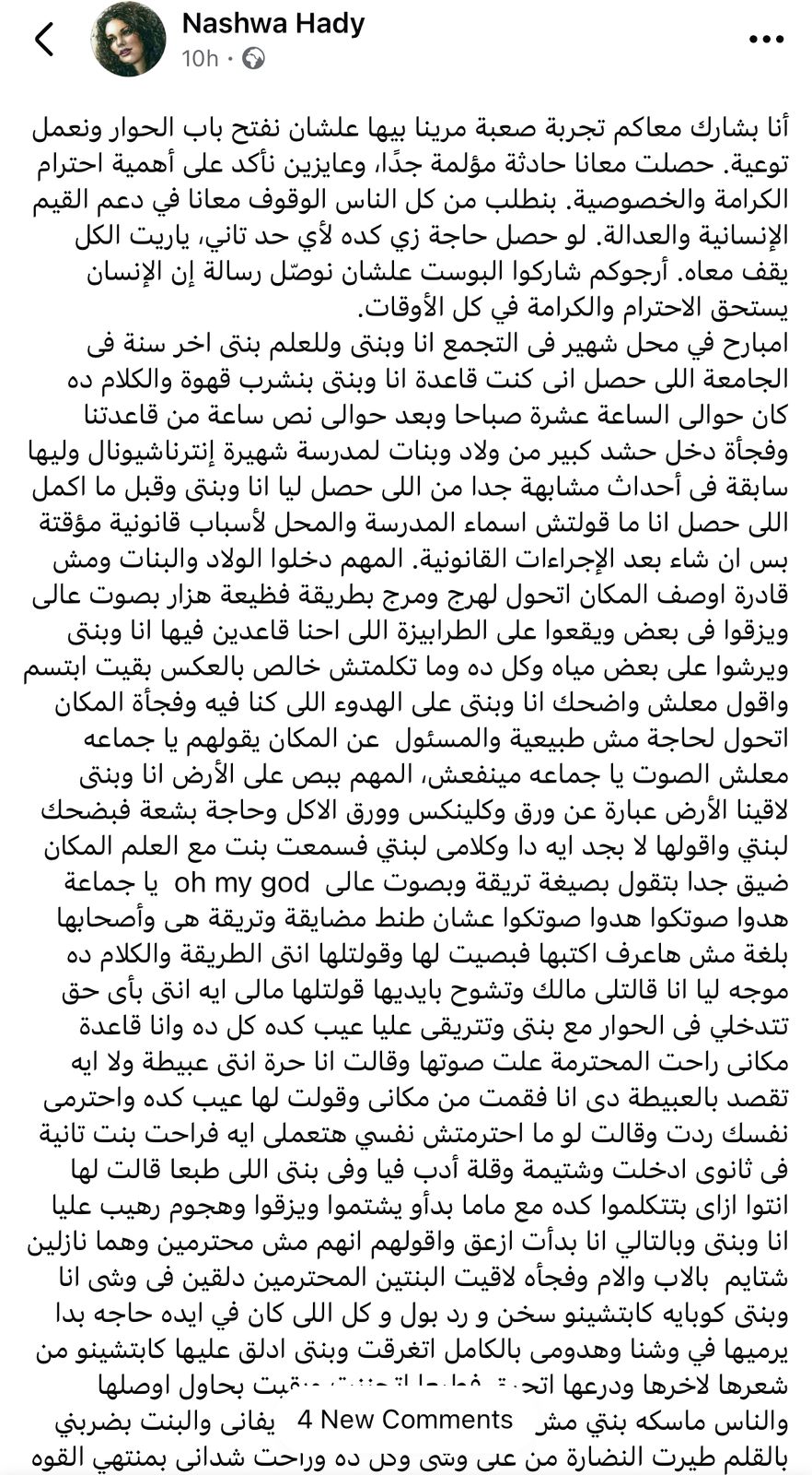 وقالت صاحبة المشكلة، "امبارح في محل شهير فى التجمع انا وبنتى وللعلم بنتى اخر سنة فى الجامعة اللى حصل انى كنت قاعدة انا وبنتى بنشرب قهوة والكلام ده كان حوالى الساعة عشرة صباحا وبعد حوالى نص ساعة من قاعدتنا وفجأة دخل حشد كبير من ولاد وبنات لمدرسة شهيرة إنترناشيونال وليها سابقة فى أحداث مشابهة جدا من اللى حصل ليا انا وبنتى وقبل ما اكمل اللى حصل انا ما قولتش اسماء المدرسة والمحل لأسباب قانونية مؤقتة بس ان شاء بعد الإجراءات القانونية".