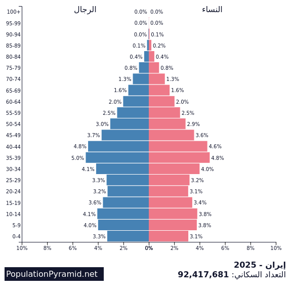 • يبلغ متوسط العمر الوسيط في إيران 34 عامًا تقريبًا عام 2025 .