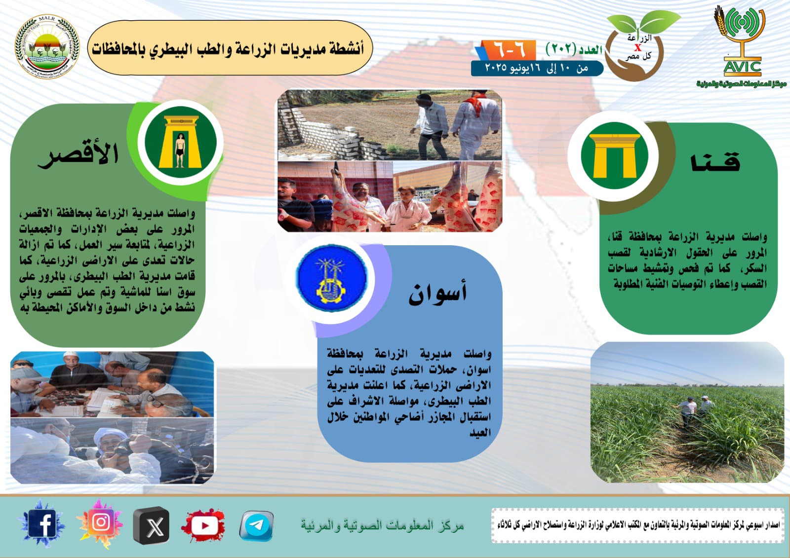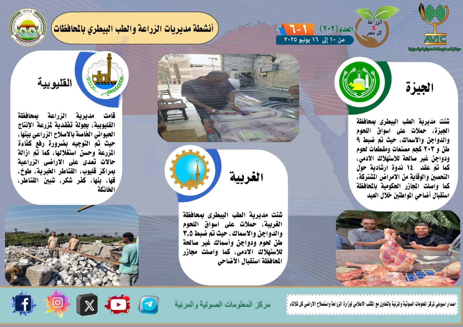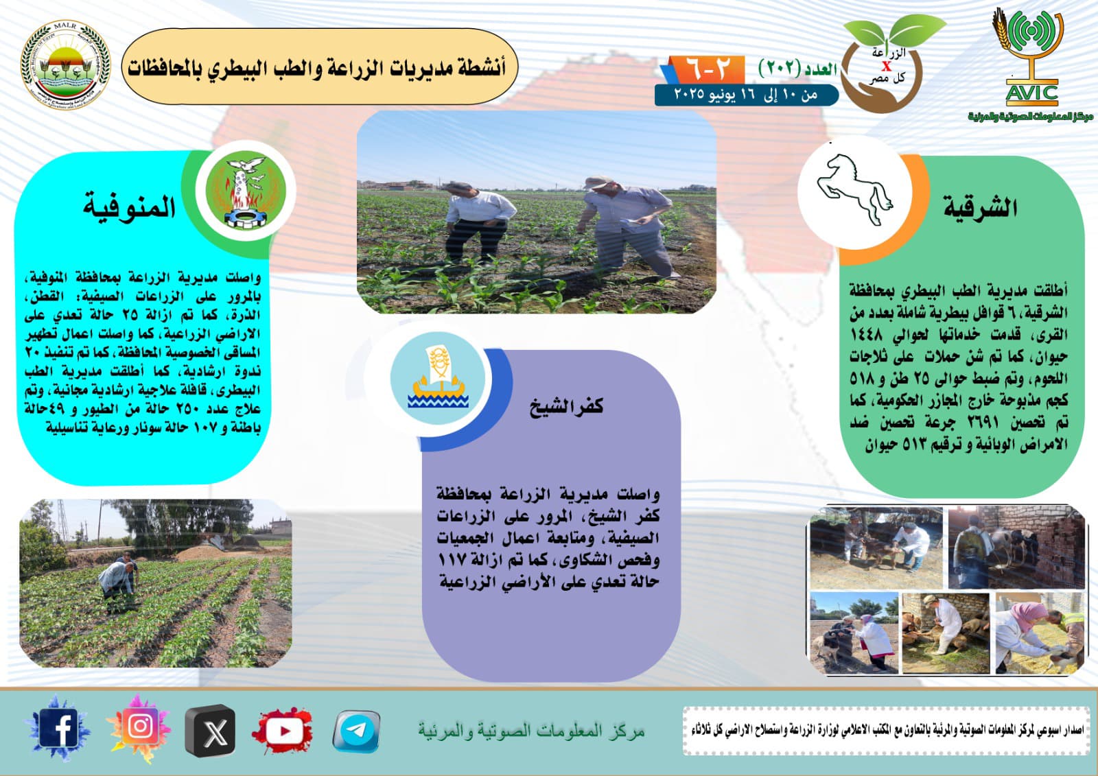 أصدر مركز المعلومات الصوتية والمرئية التابع لوزارة الزراعة واستصلاح الأراضي، والمكتب الاعلامي للوزارة، العدد رقم 202 من اصدار: "الزراعة في كل مصر" بالانفوجراف والفيديو، يوضح الجهود والانشطة التي تقوم بها مديريات الزراعة والطب البيطري بمحافظات الجمهورية خلال الفترة من 10 وحتى 16 يونيو الجاري.
