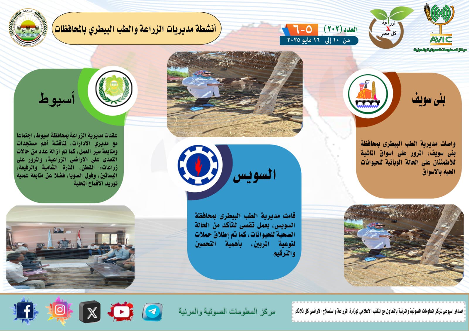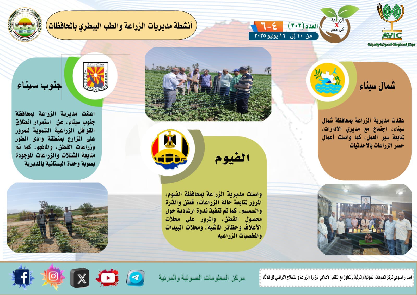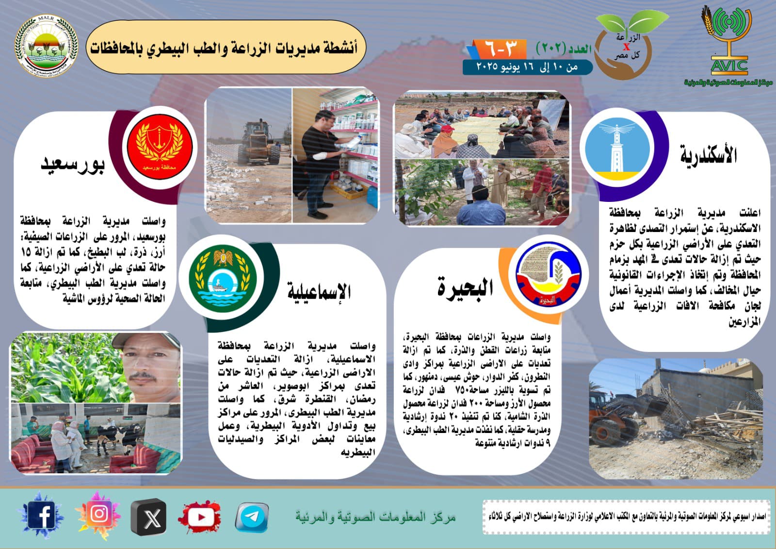 أصدر مركز المعلومات الصوتية والمرئية التابع لوزارة الزراعة واستصلاح الأراضي، والمكتب الاعلامي للوزارة، العدد رقم 202 من اصدار: "الزراعة في كل مصر" بالانفوجراف والفيديو، يوضح الجهود والانشطة التي تقوم بها مديريات الزراعة والطب البيطري بمحافظات الجمهورية خلال الفترة من 10 وحتى 16 يونيو الجاري.