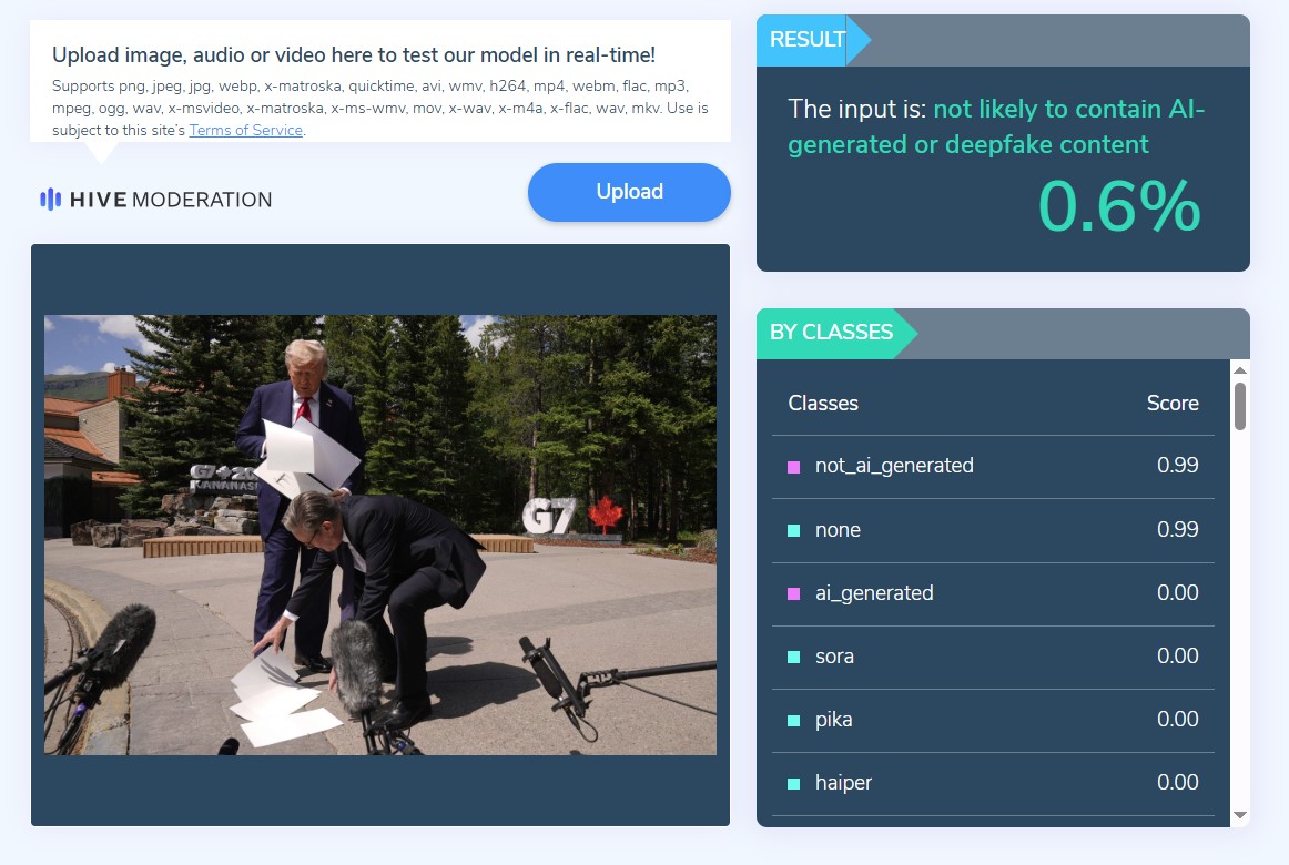 وحاول “مصر تايمز” التحقق من الصور المتداولة حيث يظهر موقع “Hive Moderation” المتخصص في التحقق من الصور، إن الصور حقيقية وغير مصنعة بواسطة الذكاء الاصطناعي، ما يشير إلى صحة الصور وعدم زيفها.