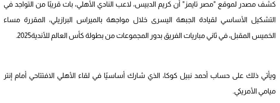 كشف الدكتور أحمد جاب الله، طبيب الفريق الأول لكرة القدم بالنادي الأهلي، عن غياب أحمد نبيل كوكا الظهير الأيسر للفريق عن مران اليوم، بسبب معاناته من كدمة في الركبة، تعرض لها خلال مشاركته مع الفريق في مواجهة إنتر ميامي.