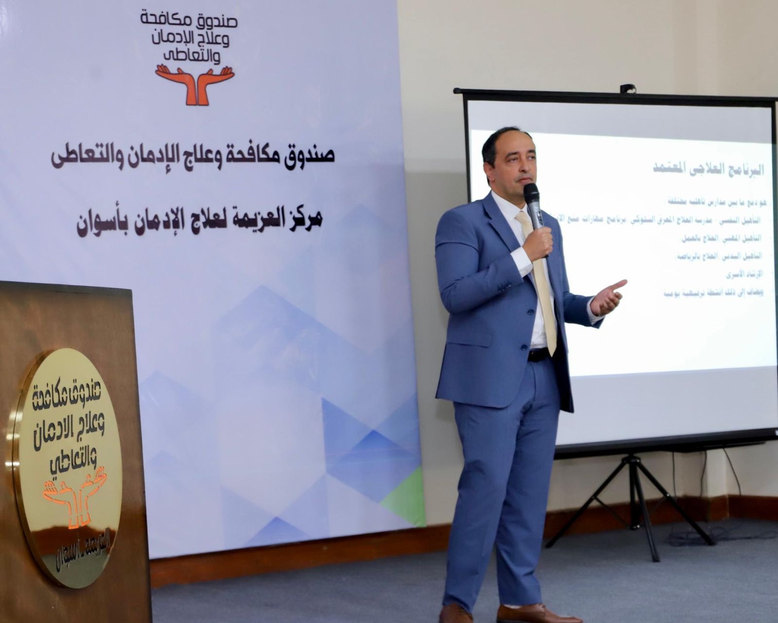من جانبه أعرب المحافظ عن سعادته بتواجده داخل مركز العزيمة بمحافظة أسوان موجها الشكر لصندوق مكافحة وعلاج الإدمان والتعاطي بقيادة الدكتور عمرو عثمان مدير الصندوق على تقديم كافة الخدمات العلاجية لمرضى الإدمان وفقا للمعايير الدولية بالتعاون مع جامعة أسوان، كما وجه المحافظ بتوفير الدعم لأنشطة الصندوق الوقائية لرفع الوعى بخطورة التعاطي وإعادة دمج المتعافين في المجتمع، مؤكدا أن مركز العزيمة عبارة عن صرح طبى نموذجي لخدمة أبناء المحافظة .