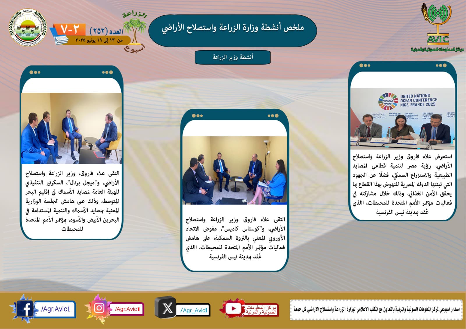 وخلال هذا الأسبوع استعرض علاء فاروق وزير الزراعة واستصلاح الأراضي، رؤية مصر لتنمية قطاعي المصايد الطبيعية والاستزراع السمكي، فضلًا عن الجهود التي تبنتها الدولة المصرية للنهوض بهذا القطاع بما يحقق الأمن الغذائي، وذلك خلال مشاركته في فعاليات مؤتمر الأمم المتحدة للمحيطات، الذي عُقد بمدينة نيس الفرنسية، كما التقى ايضا، و"كوستاس كاديس"، مفوض الاتحاد الأوروبي المعني بالثروة السمكية، فضلا عن "ميجل برنال"، السكرتير التنفيذي للهيئة العامة لمصايد الأسماك في إقليم البحر المتوسط.