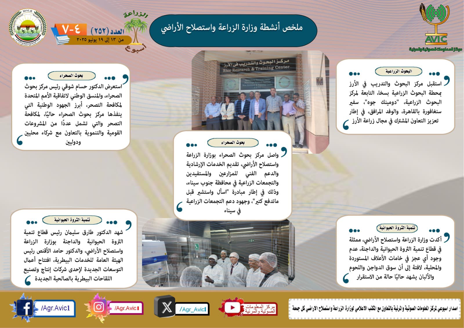 بينما استقبل المجزر الآلي المُطوَّر التابع لـصندوق التأمين على الثروة الحيوانية بمنطقة النوبارية، زيارة تدريبية لطلاب قسم الإنتاج الحيواني بـكلية الزراعة جامعة عين شمس، كما تفقد الدكتور ياسر الحيمرى مدير معهد بحوث الإرشاد الزراعي والمنسق العام للبرامج الإرشادية والتدريبية لمركز البحوث الزراعية، منطقة وادى الصعايده بأسوان للوقوف على الاحتياجات الإرشادية والتنموية للمزارعين في المنطقة، كذلك نفذت الإدارة المركزية للإرشاد الزراعي، سلسلة من الندوات والأنشطة الإرشادية، والتواصل مع المزارعين في الحقول، خلال الأسبوع الماضي، بهدف تقديم الدعم الفني لمزارعي المحاصيل المختلفة في بعض المحافظات.