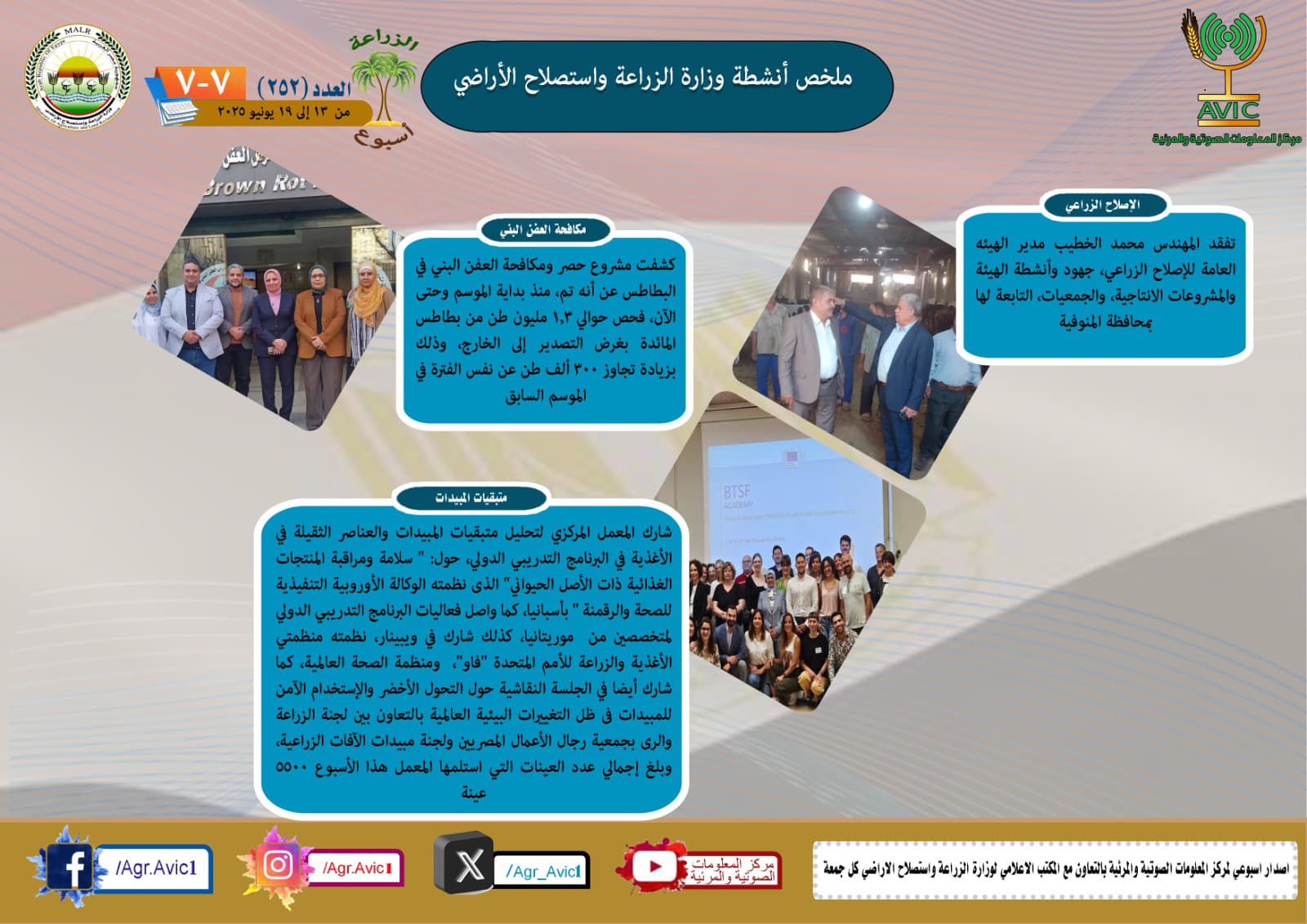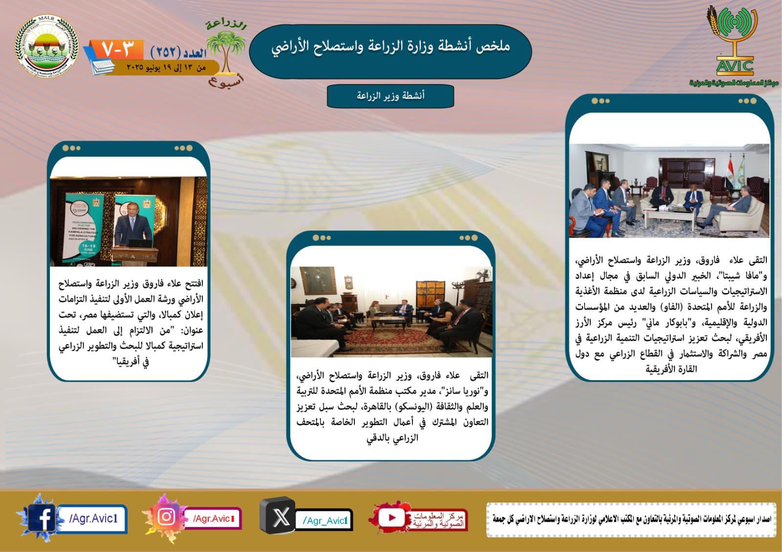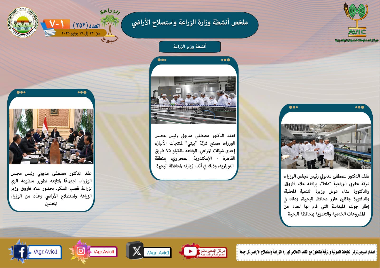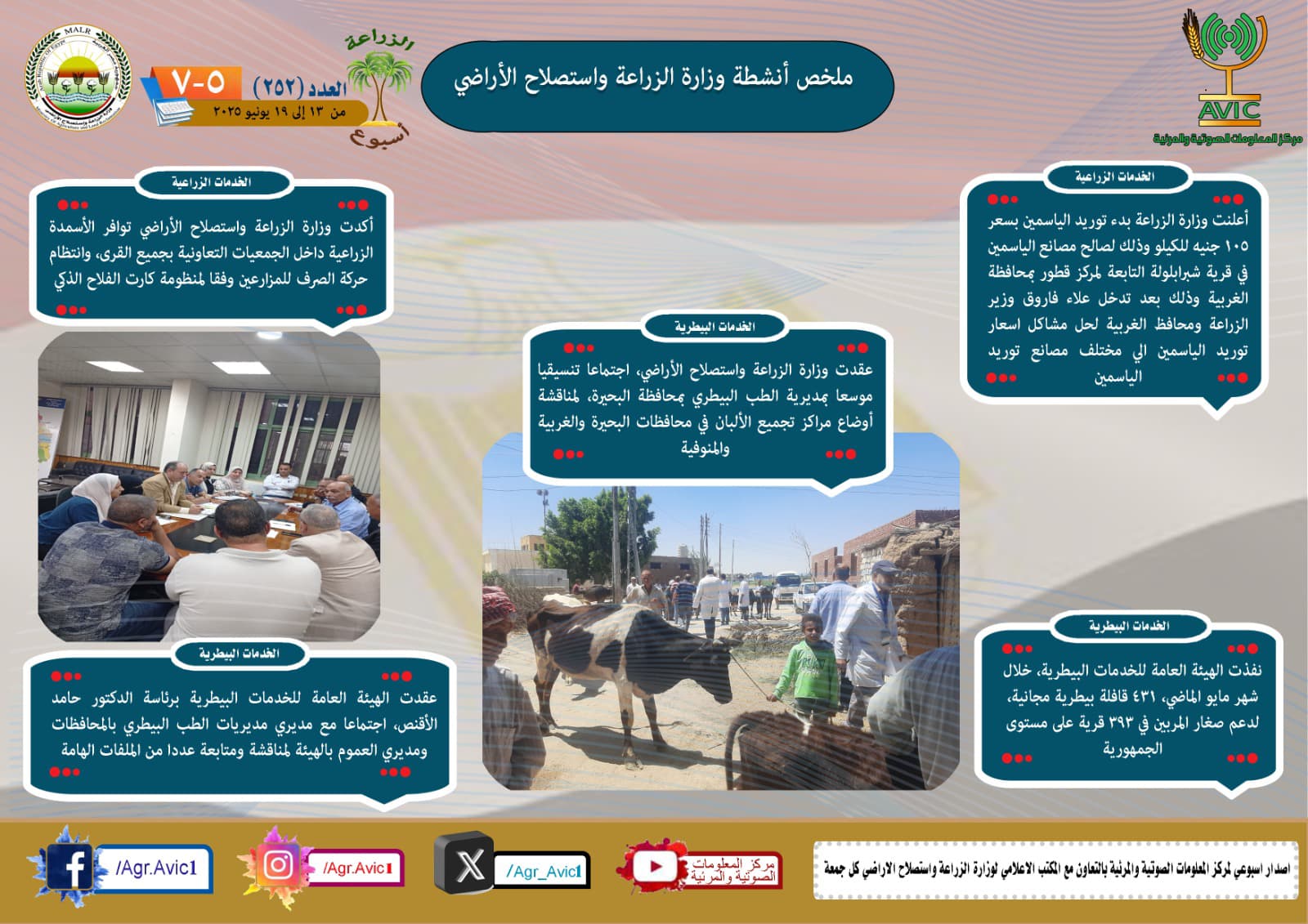 يذكر ان مركز المعلومات الصوتية والمرئية، والمكتب الاعلامي للوزارة، يصدران الجمعة من كل اسبوع، انفوجرافا وفيديو باسم: الزراعة في اسبوع، لالقاء الضوء على ملخص ما تم من انشطة وجهود، بكافة القطاعات والهيئات، التابعة للوزارة، فضلا عن انفوجراف وفيديو كل ثلاثاء باسم: الزراعة في كل مصر، حول انشطة وجهود القطاع الزراعي، بالمحافظات المختلفة.
