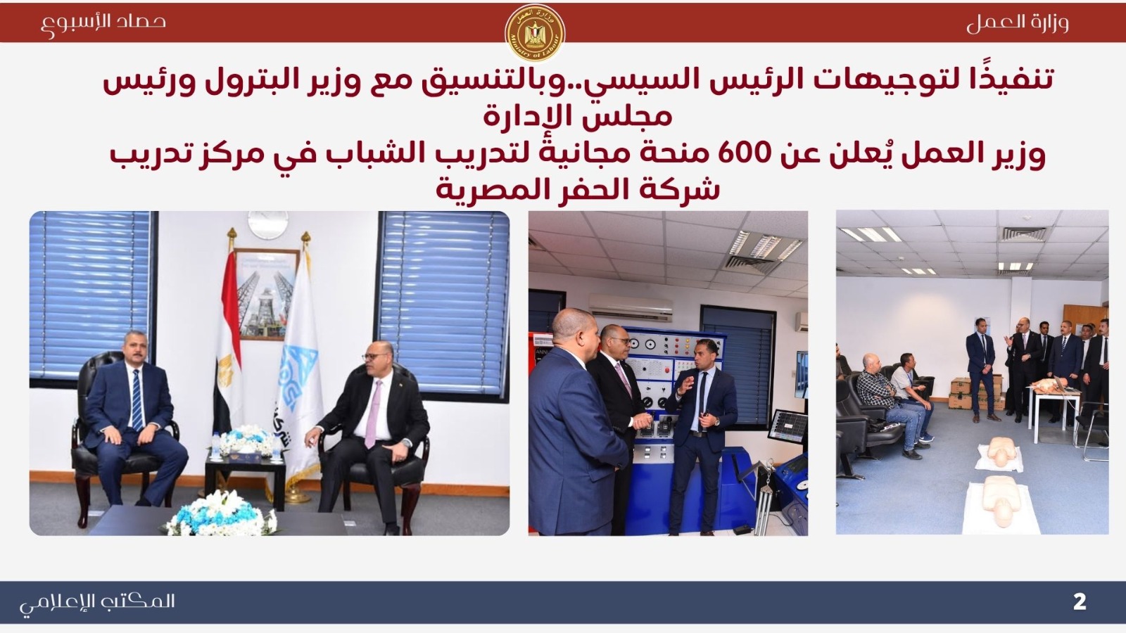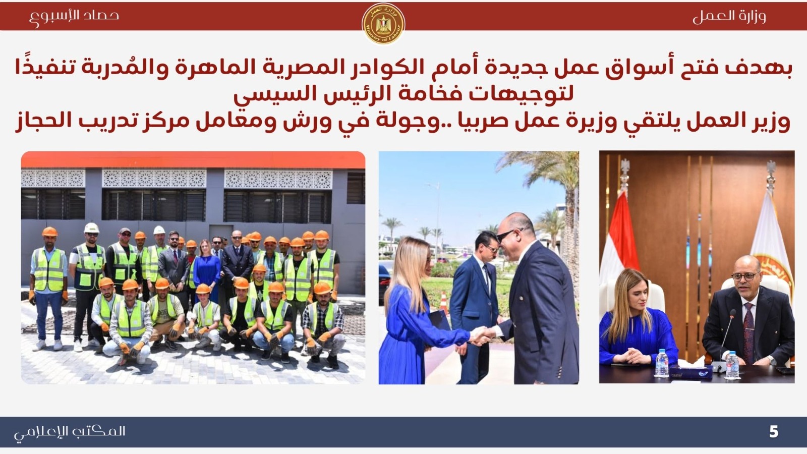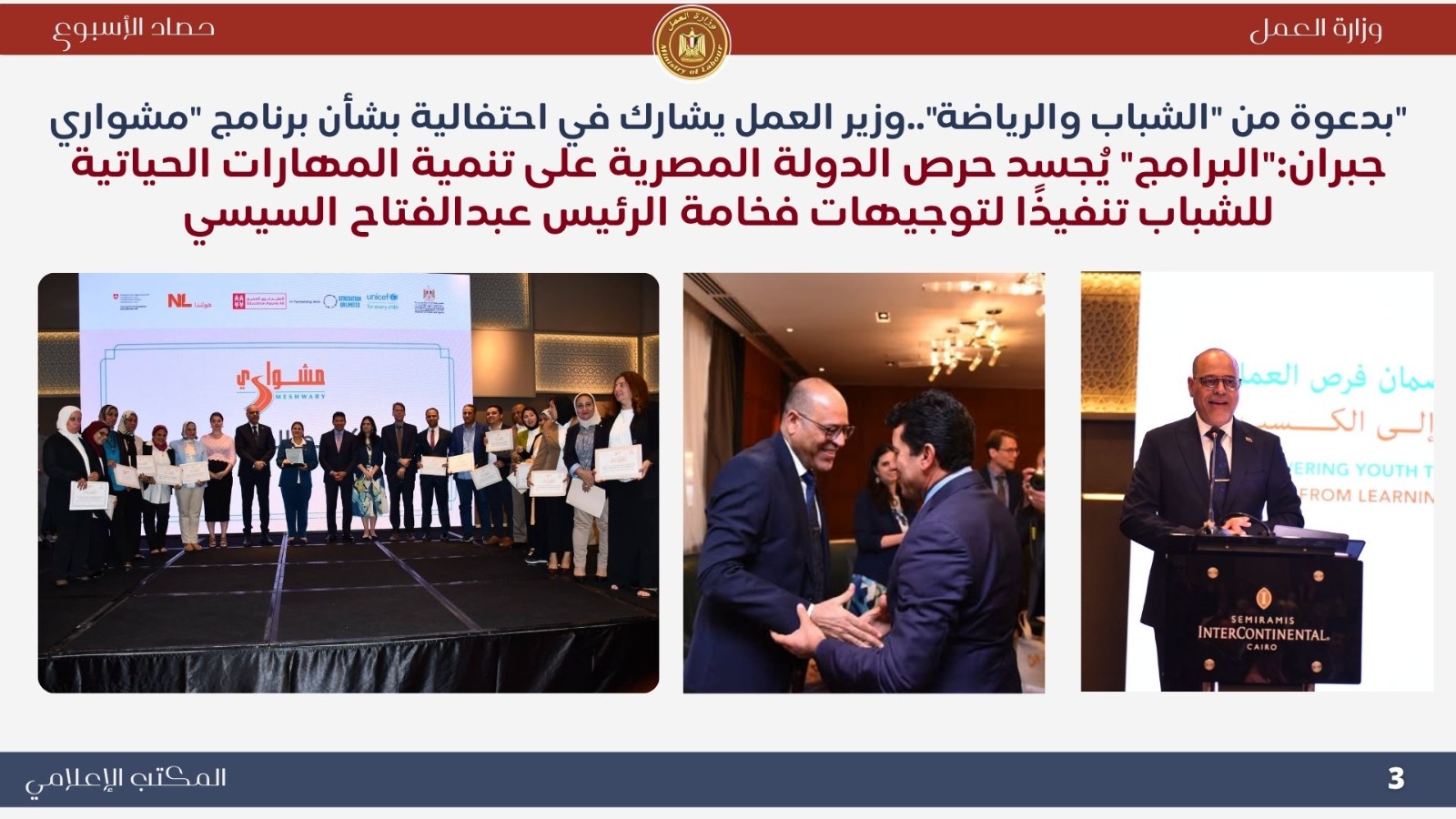 وبدعوة من وزير الشباب والرياضة د. أشرف صبحي ،شارك وزير العمل في احتفالية بشأن برنامج "مشواري"،للتأكيد على أن "البرامج" يُجسد حرص الدولة المصرية على تنمية المهارات الحياتية للشباب تنفيذًا لتوجيهات فخامة الرئيس عبدالفتاح السيسي ..كما شهد هذا الأسبوع استمرار اختبارات المتقدمين على فرص عمل وفرتها الوزارة للشباب بالخارج ، وكذلك استمرار مديريات العمل بالمحافظات في تنفيذ خطط الوزارة خاصة نشر ثقافة السلامة والصحة المهنية وتعظيم علاقات العمل في مواقع الإنتاج لصالح طرفي العملية الإنتاجية،كذلك استمرار مكاتب التمثيل العمالي بالخارج بالتواصل مع العمال والاستجابة الفورية لمطالبهم المشروعة.