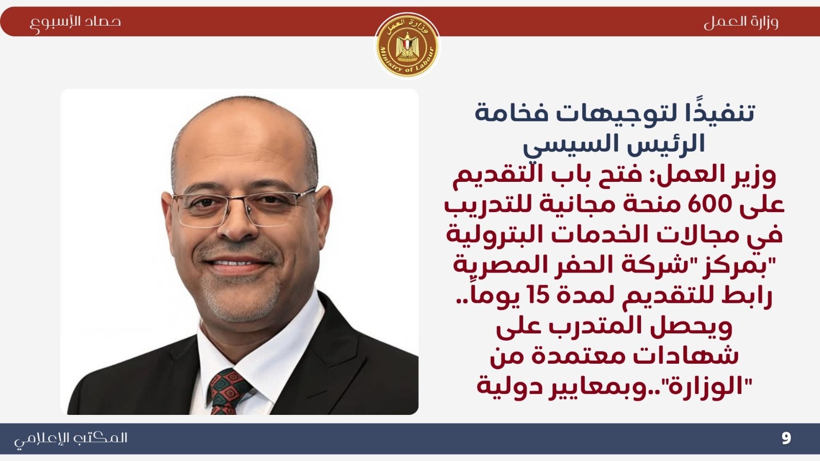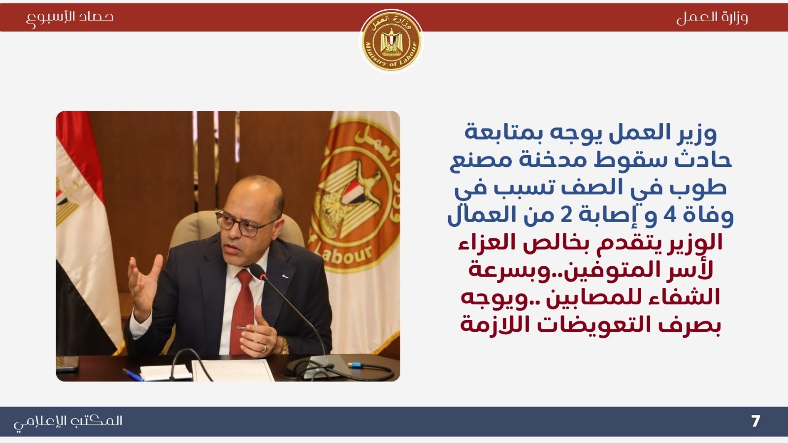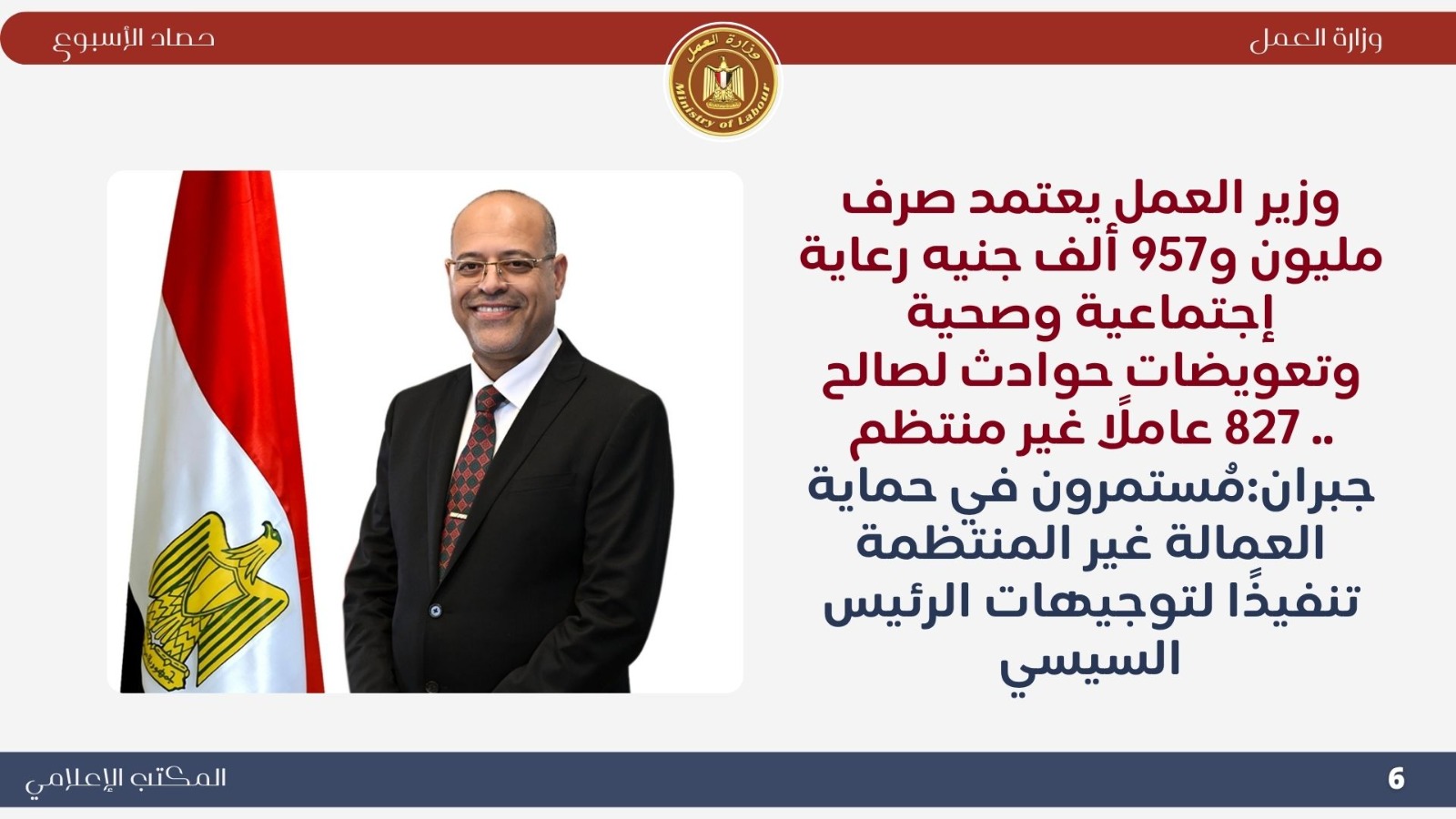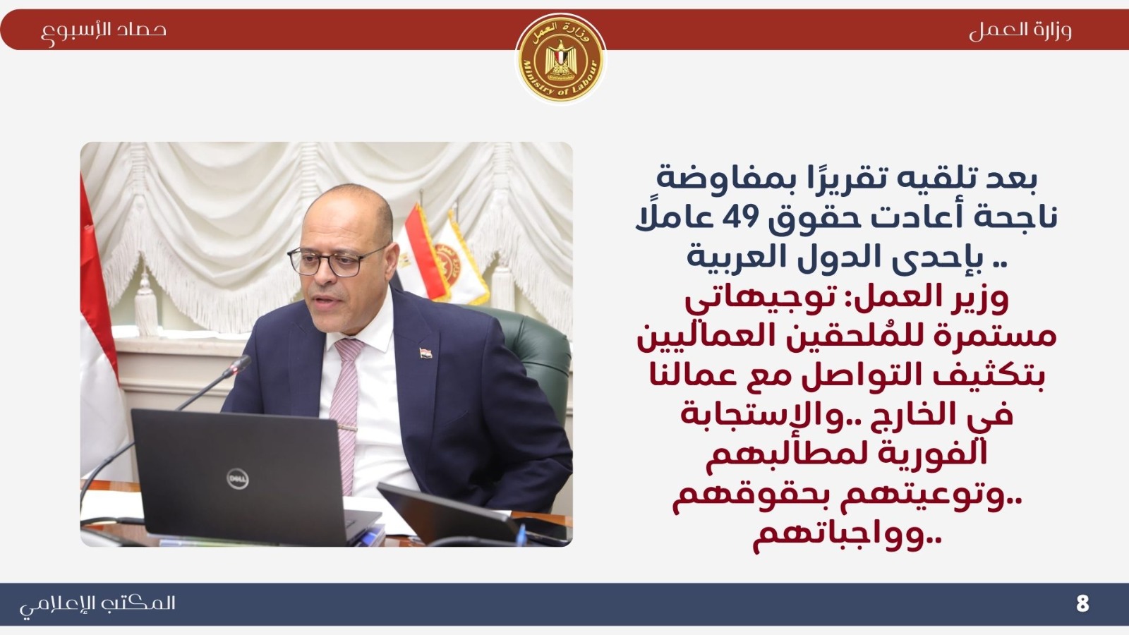 وبدعوة من وزير الشباب والرياضة د. أشرف صبحي ،شارك وزير العمل في احتفالية بشأن برنامج "مشواري"،للتأكيد على أن "البرامج" يُجسد حرص الدولة المصرية على تنمية المهارات الحياتية للشباب تنفيذًا لتوجيهات فخامة الرئيس عبدالفتاح السيسي ..كما شهد هذا الأسبوع استمرار اختبارات المتقدمين على فرص عمل وفرتها الوزارة للشباب بالخارج ، وكذلك استمرار مديريات العمل بالمحافظات في تنفيذ خطط الوزارة خاصة نشر ثقافة السلامة والصحة المهنية وتعظيم علاقات العمل في مواقع الإنتاج لصالح طرفي العملية الإنتاجية،كذلك استمرار مكاتب التمثيل العمالي بالخارج بالتواصل مع العمال والاستجابة الفورية لمطالبهم المشروعة.