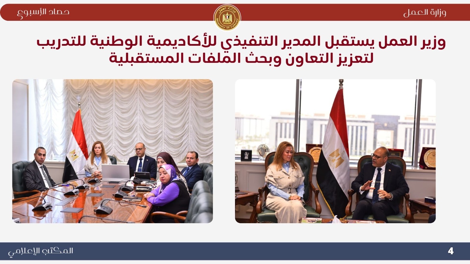 وخلال هذا الأسبوع أيضا استقبل وزير العمل محمد جبران ،د.رشا راغب المدير التنفيذي للأكاديمية الوطنية للتدريب ، لبحث مجالات التعاون القائمة والمشتركة بين الوزارة والأكاديمية الوطنية للتدريب.