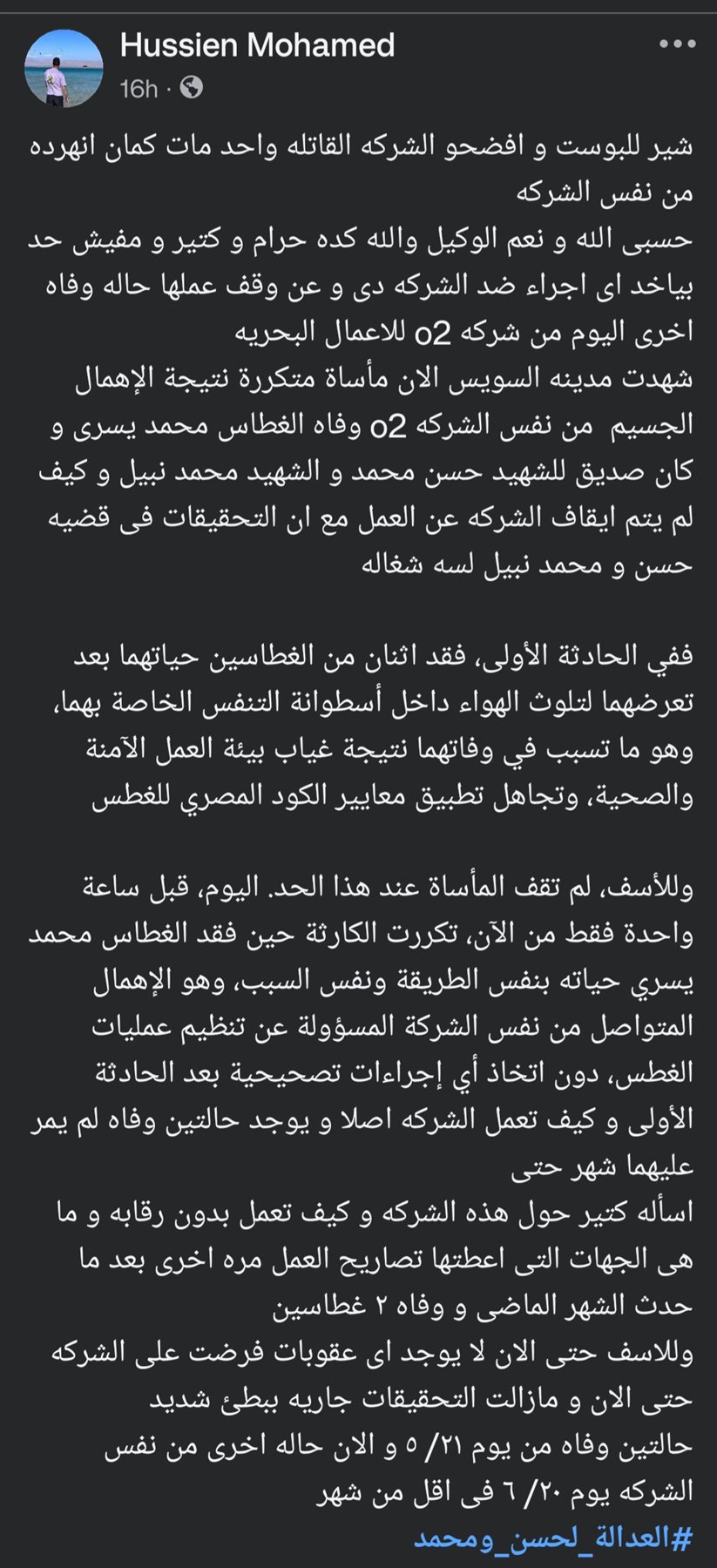 وأكدت المنشورات وفاة الشاب محمد يسري، البالغ من العمر 28 عامًا، إثر حادث غرق أثناء العمل، وهو الحادث الثالث من نوعه خلال أقل من شهر داخل الشركة ذاتها، بعد وفاة كل من الغطاسين محمد نبيل وحسن عدلي في حادث سابق لا يزال قيد التحقيق.