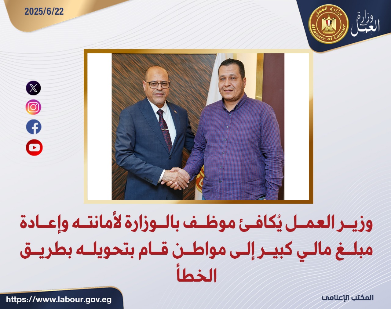وزير العمل يُكافئ موظف لأمانته بعد إعادة مبلغ مالي لمواطن حوّله له بالخطأ