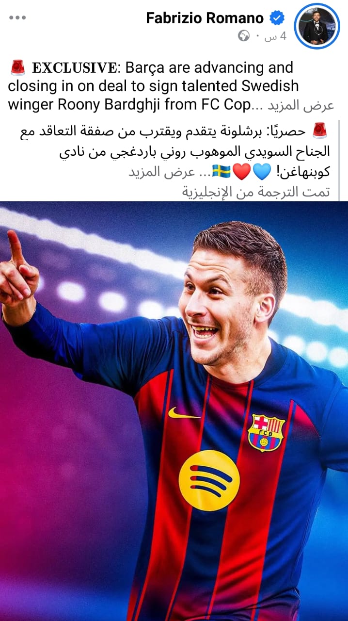 حصريًا: برشلونة يتقدم ويقترب من حسم صفقة التعاقد مع الجناح السويدي روني باردغجي من كوبنهاغن! الاتفاق في مراحله النهائية، ومن المتوقع الانتهاء من التفاصيل الأخيرة خلال الأيام القليلة المقبلة. اللاعب من المقرر أن ينضم للنادي في يوليو.
