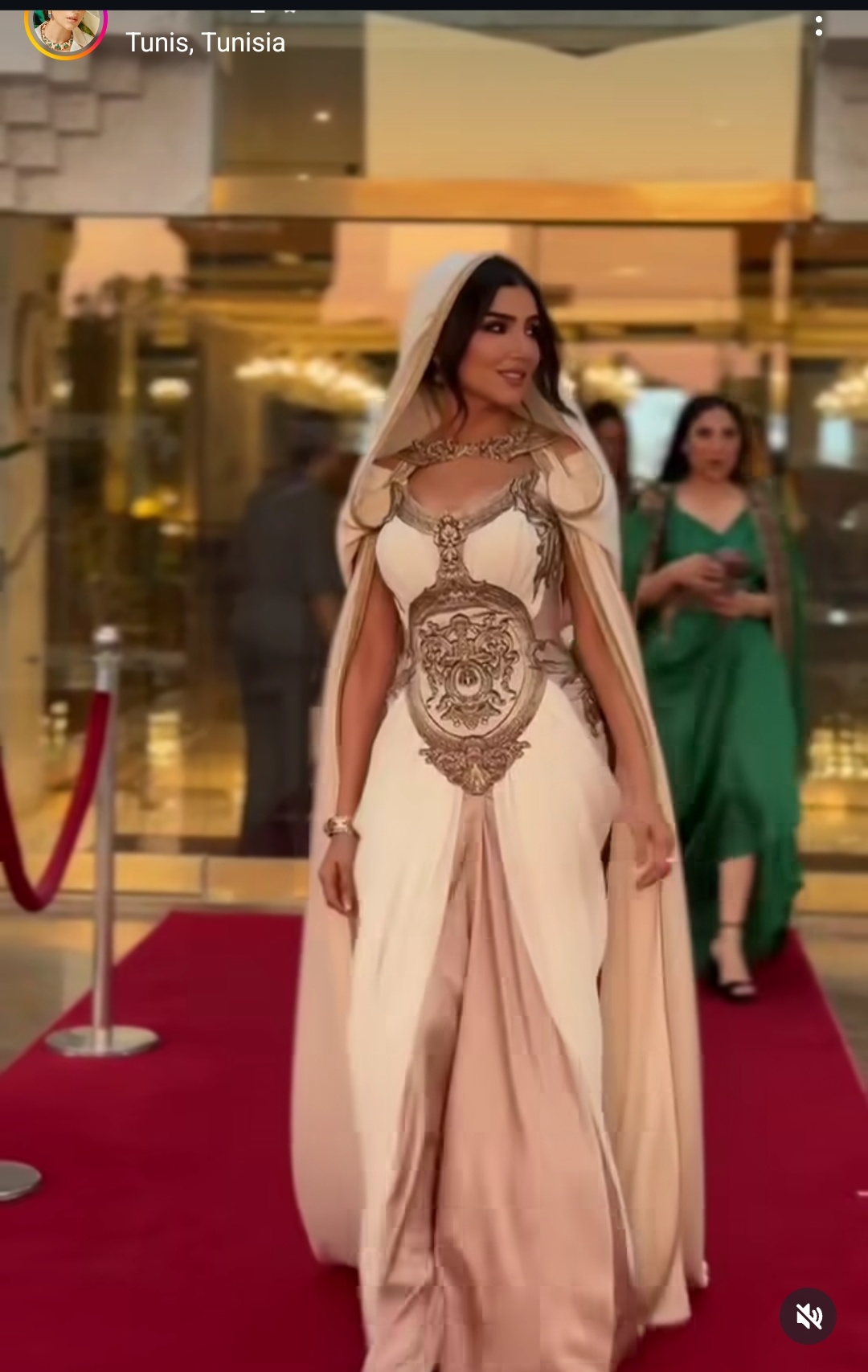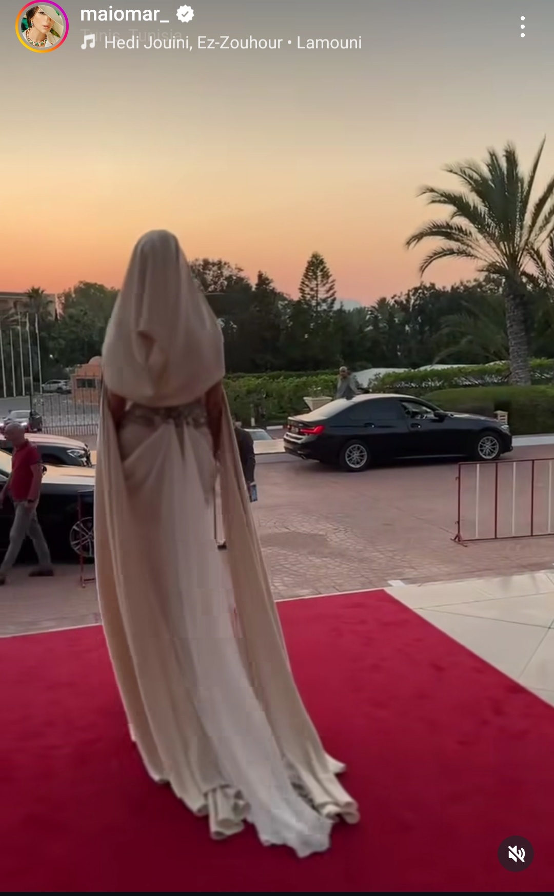 ظهرت مي عمر بإطلاله جذابة خطفت الانفاس، باتدائها القفطان التونسي، واضعا مساحيق تجميل أبرزت جمالها، مجمعه شعرها ومنسدله خصلات من شعرها على جانبي وجهها، مرتدين قرطاج وسوارا وخاتم أنيقا.