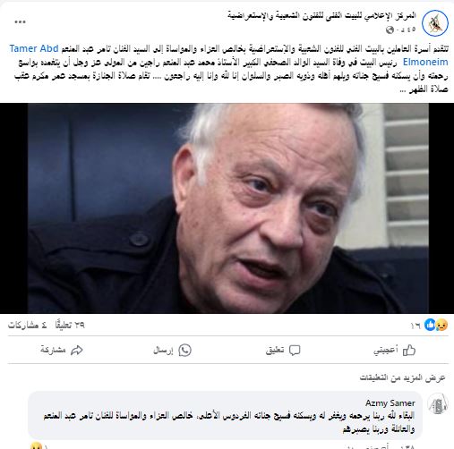 وكتبت الصفحة الرسمية للبيت الفني للفنون الشعبية عبر الصفحة الرسمية علي فيس بوك" تتقدم أسرة العاملين بالبيت الفني للفنون الشعبية والاستعراضية بخالص العزاء والمواساة إلى السيد الفنان تامر عبد المنعم رئيس البيت في وفاة السيد الوالد الصحفي الكبير محمد عبد المنعم راجين من المولى عز وجل أن يتغمده بواسع رحمته وأن يسكنه فسيح جناته ويلهم أهله وذويه الصبر والسلوان إنا لله وإنا إليه راجعون.. تقام صلاة الجنازة بمسجد عمر مكرم عقب صلاة الظهر".