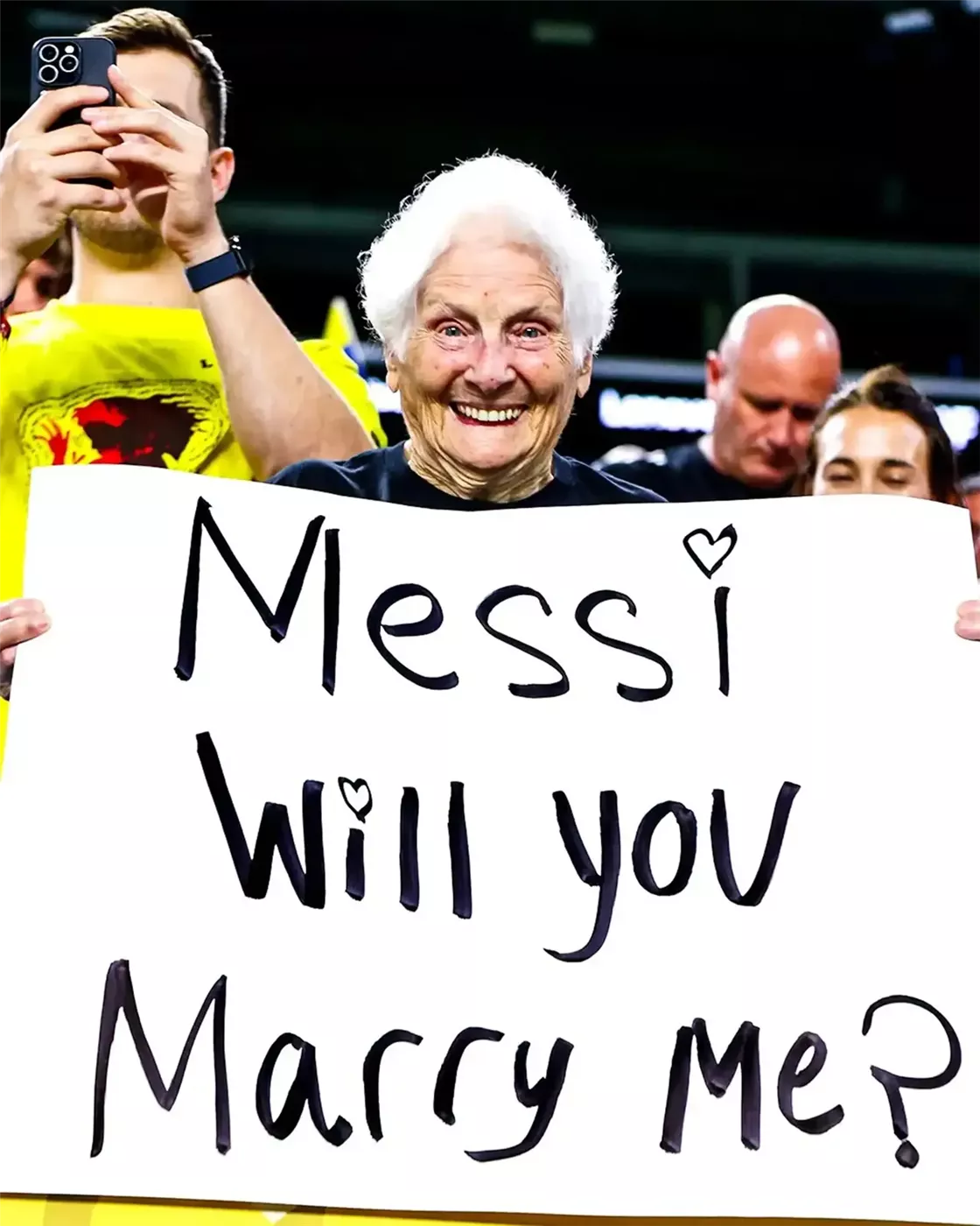 وأظهرت كاميرات النقل المباشر السيدة المسنّة وهي ترفع لافتة كتب عليها بوضوح: "ميسي، هل تتزوجني؟"