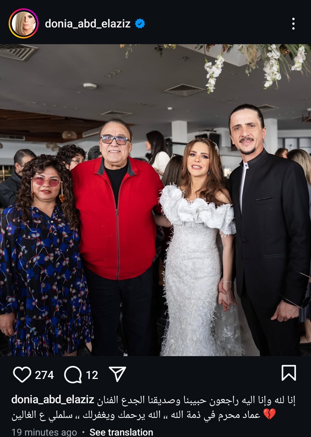 وكتبت عبر حسابها الرسمي على موقع التواصل الاجتماعي لتبادل الصور والفيديوهات الانستجرام: “إنا لله وإنا اليه راجعون حبيبنا وصديقنا الجدع الفنان عماد محرم في ذمة الله، الله يرحمك ويغفر لك، سلملي ع الغالين”.