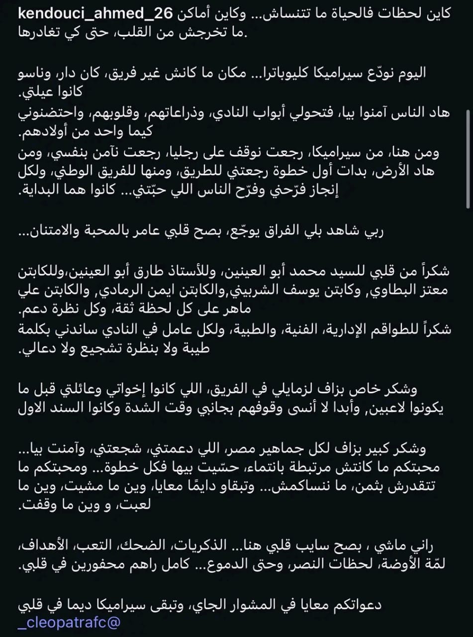 كاين لحظات فالحياة ما تتنساش وكاين أماكن ما تخرجش من القلب، حتى كي تغادرها. اليوم نودّع سيراميكا كليوباترا مكان ما كانش غير فريق، كان دار، وناسو كانوا عيلتي.