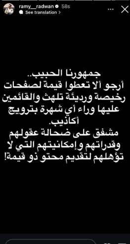 وقال رامي رضوان عبر حسابه الرسمي على “فيسبوك”: “جمهورنا الحبيب.. أرجو ألا تعطوا قيمة لصفحات رخيصة ورديئة تلهث والقائمين عليها وراء أي شهرة بترويج أكاذيب، مشفق على ضحالة عقولهم وقدراتهم وإمكانيتهم التي لا تؤهلهم لتقديم محتو ذو قيمة”.