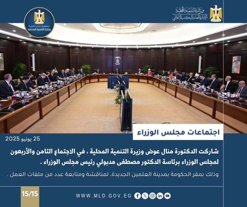 كما شاركت الدكتورة منال عوض وزيرة التنمية المحلية، في الاجتماع الثامن والأربعون لمجلس الوزراء برئاسة الدكتور مصطفى مدبولي رئيس مجلس الوزراء، وذلك بمقر الحكومة بمدينة العلمين الجديدة، لمناقشة ومتابعة عدد من ملفات العمل.