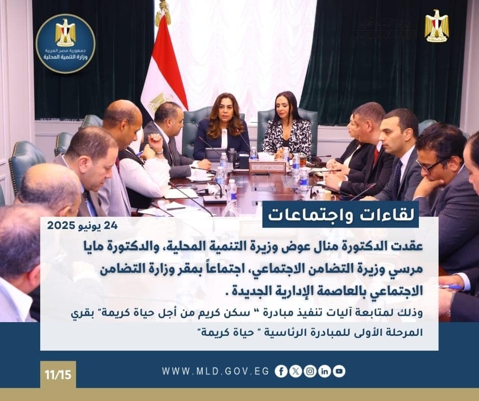 عقدت الدكتورة منال عوض وزيرة التنمية المحلية، والدكتورة مايا مرسي وزيرة التضامن الاجتماعي، اجتماعاً بمقر وزارة التضامن الاجتماعي بالعاصمة الإدارية الجديدة، وذلك لمتابعة آليات تنفيذ مبادرة “ سكن كريم من أجل حياة كريمة" بقري المرحلة الأولى للمبادرة الرئاسية " حياة كريمة"، والتي تم تدشينها الأسبوع الجاري تحت رعاية دولة رئيس مجلس الوزراء الدكتور مصطفى مدبولي.