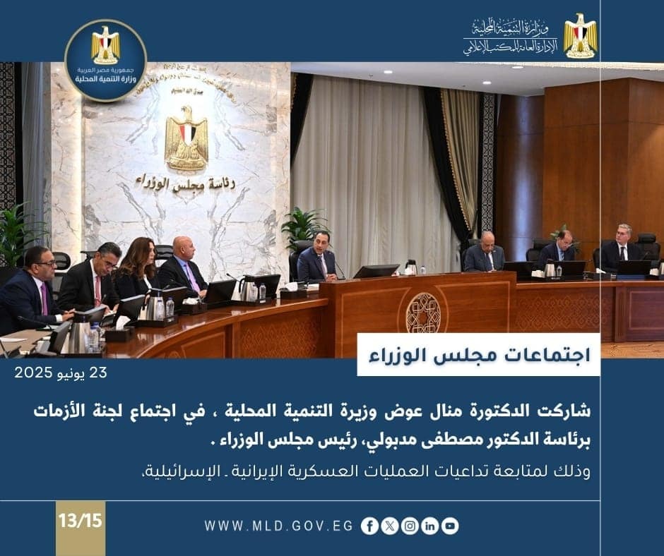 كما شاركت الدكتورة منال عوض وزيرة التنمية المحلية ، في اجتماع لجنة الأزمات ، برئاسة الدكتور مصطفى مدبولي، رئيس مجلس الوزراء، لمتابعة تداعيات العمليات العسكرية الإيرانية ـ الإسرائيلية.