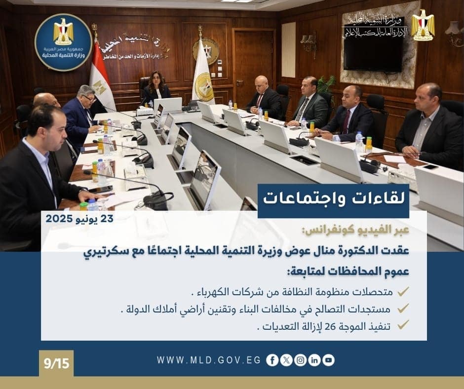 عقدت الدكتورة منال عوض وزيرة التنمية المحلية، إجتماعاً مع سكرتيري عموم المحافظات عبر الفيديو كونفرانس من مركز سيطرة الشبكة الوطنية للطوارئ والسلامة العامة بمقر الوزارة بالعاصمة الإدارية الجديدة ، لمتابعة مستجدات ملفات التصالح والمتغيرات المكانية والتقنين والموجة الـ ٢٦ لإزالة التعديات ومتحصلات شركات الكهرباء لمنظومة النظافة .