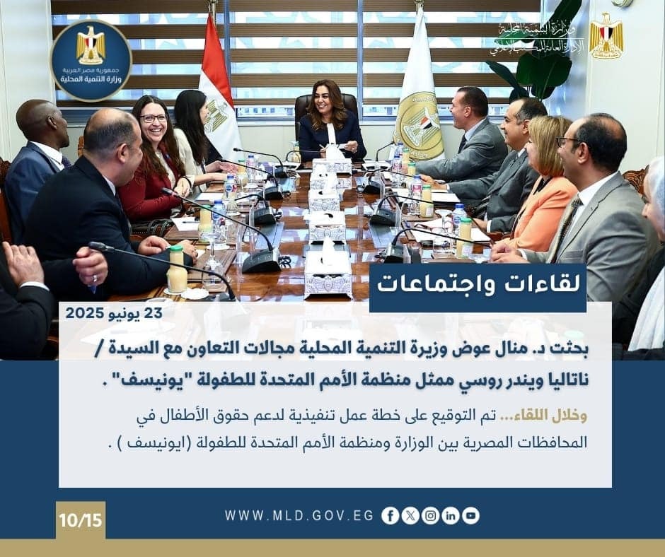 وعقدت الدكتورة منال عوض وزيرة التنمية المحلية، اجتماعاً مع السيدة / ناتاليا ويندر روسي ممثل منظمة الأمم المتحدة للطفولة (يونيسف) والوفد المرافق لها، وشهد اللقاء استعراض أهم مجالات ومقترحات التعاون المشترك بين الوزارة والمنظمة على أرض المحافظات فيما يخص مجالات عمل " يونيسف " وبرامج عمل وزارة التنمية المحلية ضمن برنامج عمل الحكومة المصرية ٢٠٢٤-٢٠٢٧ .