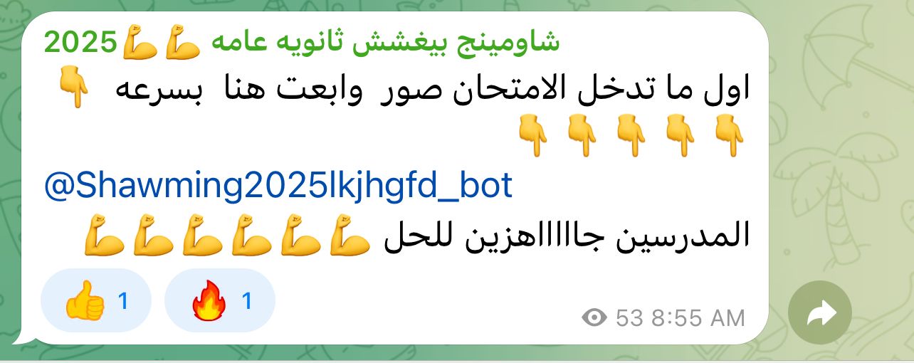 في تطور جديد ضمن محاولات الغش الإلكتروني، نشرت جروبات تليجرام المتخصصة في تسريب امتحانات الثانوية العامة، المعروفة إعلاميًا بـ"شاومينج"، رسائل تحريضية موجهة لطلاب الثانوية العامة 2025، تحثهم على تصوير امتحان اللغة الإنجليزية فور استلامه داخل اللجان.