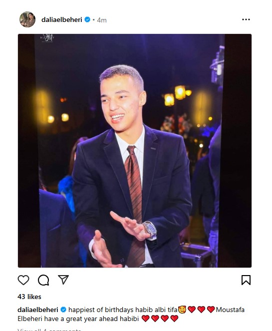 وكتبت داليا البحيري عبر حسابها الرسمي على موقع التواصل الاجتماعي لتبادل الصور والفيديوهات الانستجرام: “ كل سنة وانت طيب يا حبيب قلبي تيفا، مصفى البحيري اتمنالك سنة عظيمة قادمة يا حبيبي”.