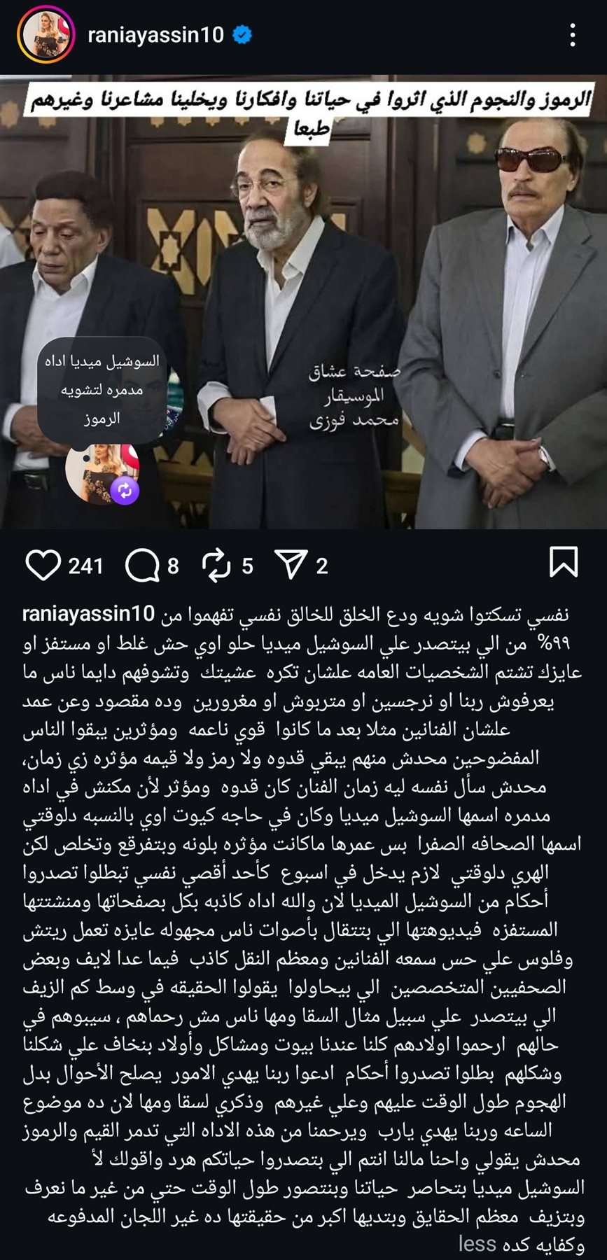 وكتبت منشور لها عبر حسابها الرسمي على موقع التواصل الاجتماعي لتبادل الصور والفيديوهات الانستجرام: “نفسي تسكتوا شويه ودع الخلق للخالق نفسي تفهموا من %99 من إلى بيتصدر علي السوشيل ميديا حلو اوي وحش غلط او مستفز او عايزك تشتم الشخصيات العامه".