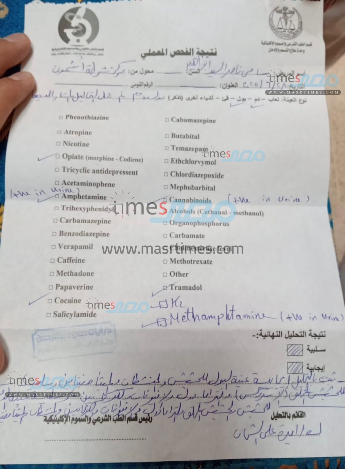 وكشفت نتائج التحاليل المعملية التي حصل عليها الموقع بشكل حصري، أن السائق ثبت تعاطيه لمخدر الحشيش، إضافة إلى منشطات قوية، وعقار الترامادول المخدر، ما يرجح بشكل كبير أن فقدانه للسيطرة على المركبة كان نتيجة لحالته غير الطبيعية وقت وقوع الحادث.