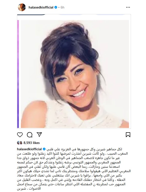 وتابعت: “وعندكم حق لان حبكم لنجمه اسعدتنا سنين ومازالت، ربما البعض كان قاسي عليها ولكن ثقتي في الجمهور المغربي العظيم اللي هيقولوا سلامتك ومنتظرينك تاني لما تشدي حيلك هيكون اكتر بكتير من اللي واجعها، براڤوا يا شيرين انك ببتتغلبي علي تعبك لاحترامك معاد الحفله ”.