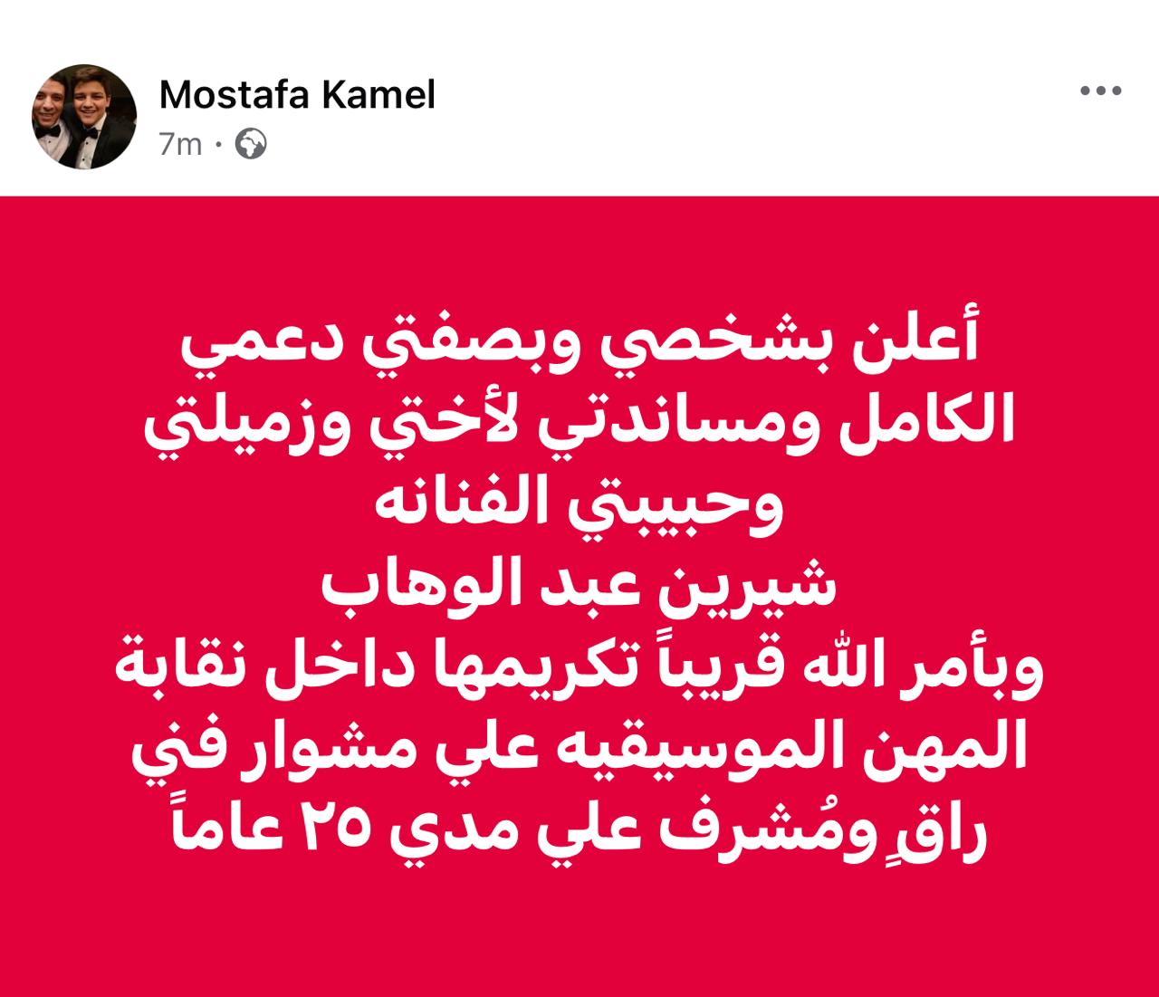وفي بيان رسمي عبر حساباته، قال مصطفى كامل: "أعلن، بشخصي وبصفتي، دعمي الكامل ومساندتي لأختي وزميلتي وحبيبتي الفنانة شيرين عبد الوهاب، وبأمر الله قريباً سيتم تكريمها داخل نقابة المهن الموسيقية، تقديراً لمشوارها الفني الراقي والمُشرف."