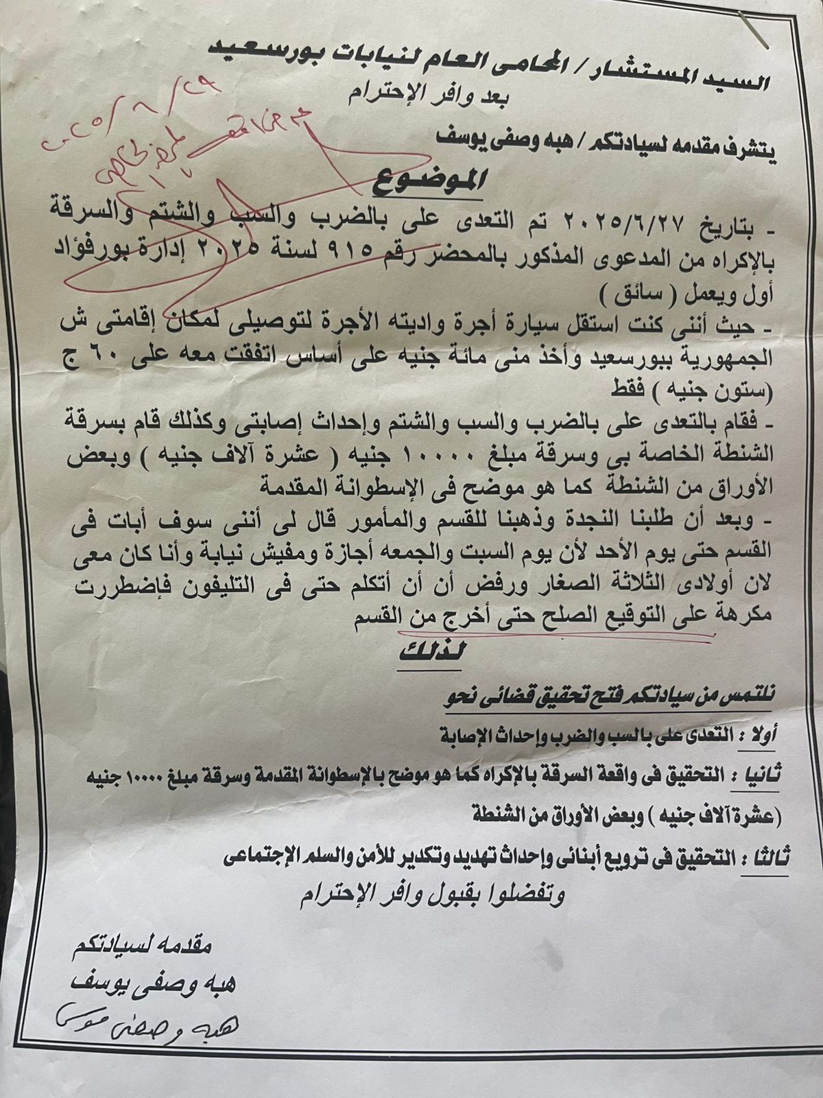 وجاء في الطلب المقدم إلى جهات التحقيق أن الواقعة حدثت يوم 27 يونيو 2025، وتم الاعتداء عليها بالضرب والسب والسرقة بالإكراه من سائق تاكسي، في المحضر رقم 915 لسنة 2025 إداري بورفؤاد أول. وأوضحت أنها كانت قد استقلت سيارة أجرة وأعطت السائق الأجرة المتفق عليها (60 جنيهًا)، لكنه طالبها بـ100 جنيه، ثم اعتدى عليها وأحدث إصابتها وسرق منها حقيبتها التي كانت تحتوي على مبلغ 10 آلاف جنيه، وبعض الأوراق الهامة، وهو ما وثقه الفيديو المرفق ضمن البلاغ.