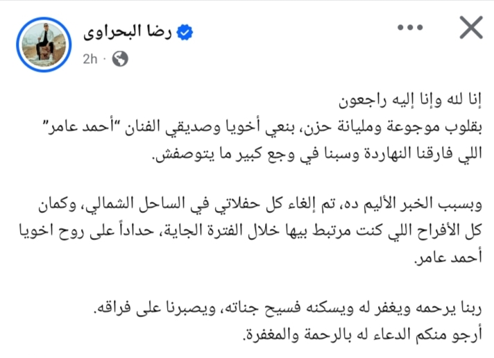 وفي منشور آخر، قام بتأجيل جميع حفلاته وافراحه، وكتب: "إنا لله وإنا إليه راجعون.. بقلوب موجوعة ومليانة حزن، بنعي أخويا وصديقي الفنان “أحمد عامر” اللي فارقنا النهاردة وسبنا في وجع كبير ما يتوصفش".