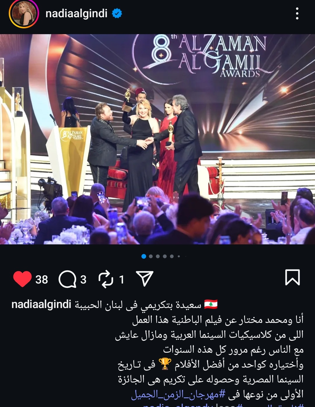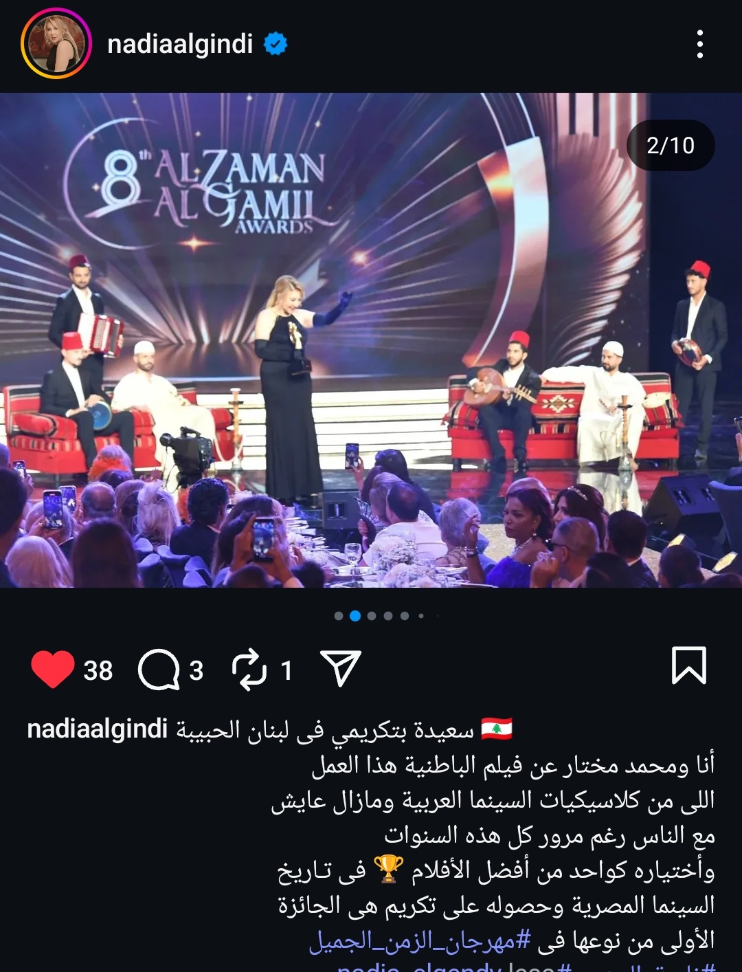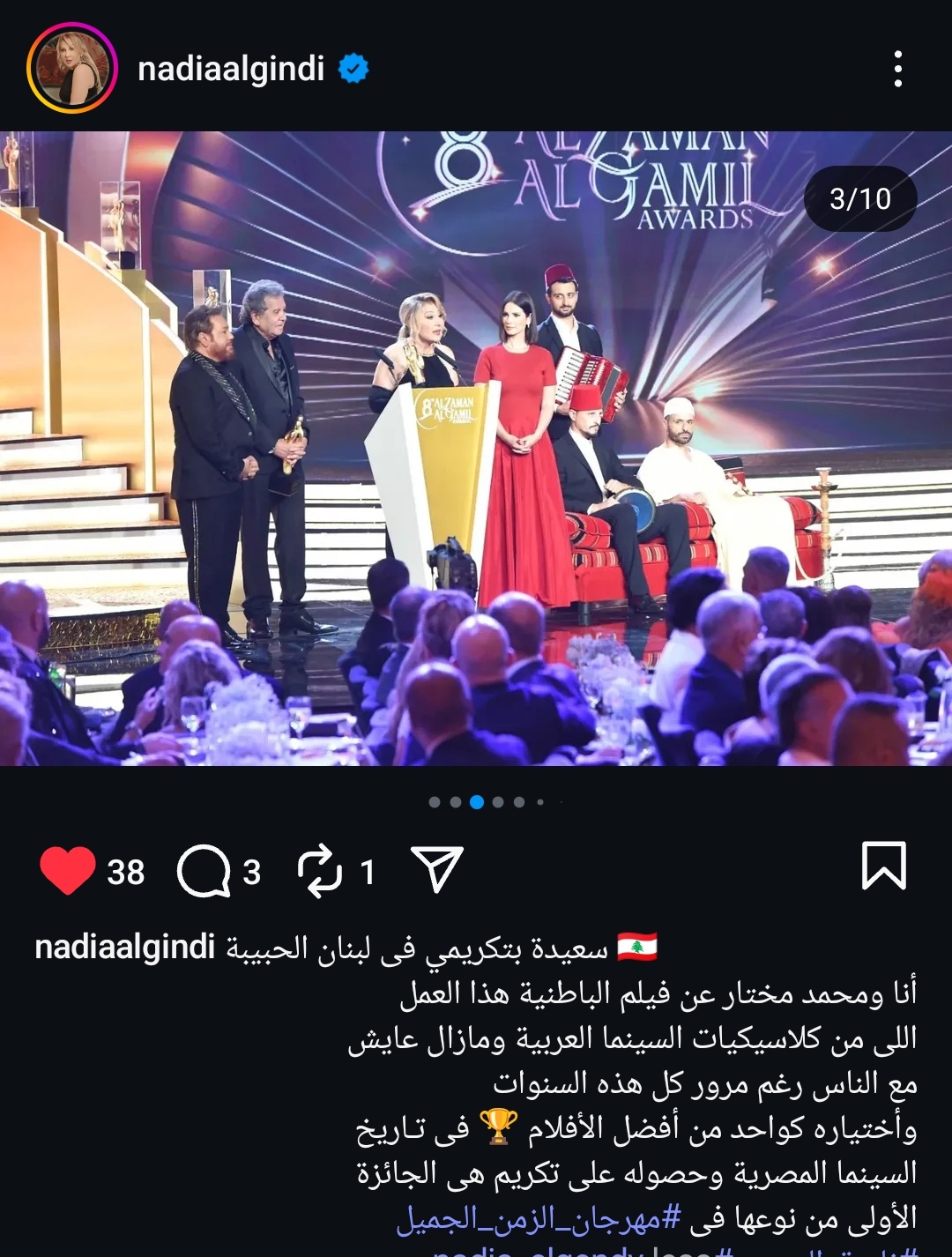 ونشرت نادية الجندي عبر حسابها الرسمي على موقع التواصل الاجتماعي لتبادل الصور والفيديوهات الانستجرام: “سعيدة بتكريمي في لبنان الحبيبة، أنا ومحمد مختار عن فيلم الباطنية هذا العمل اللى من كلاسيكيات السينما العربية ومازال عايش مع الناس رغم مرور كل هذه السنوات”.