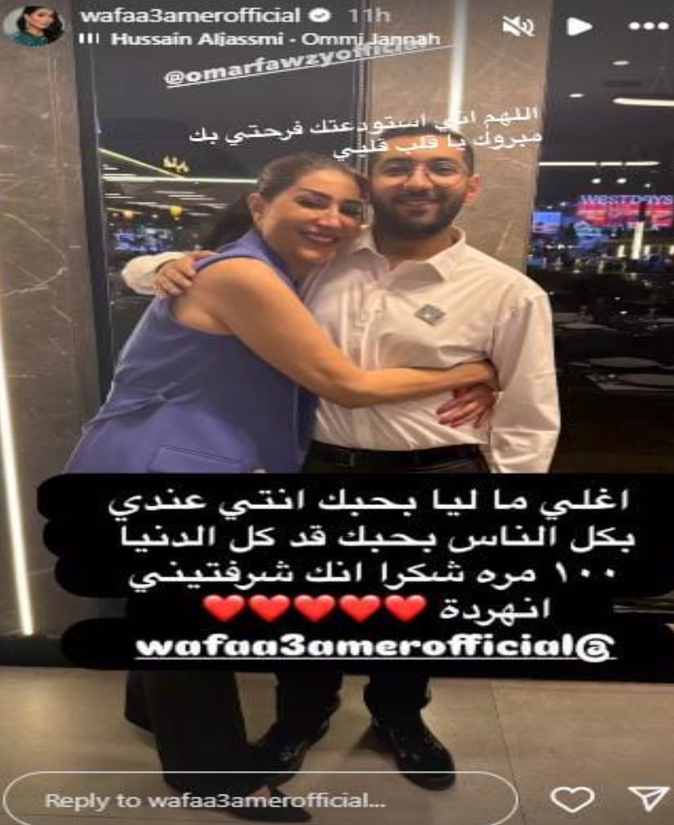 هنأت الفنانة وفاء عامر نجلها عمر فوزى بتخرجه، و جهته له رسالة مليئة بالسعادة والفرحة، وذلك عبر خاصية الاستوري عبر حسابها الرسمي على موقع التواصل الاجتماعي لتبادل الصور والفيديوهات الانستجرام.