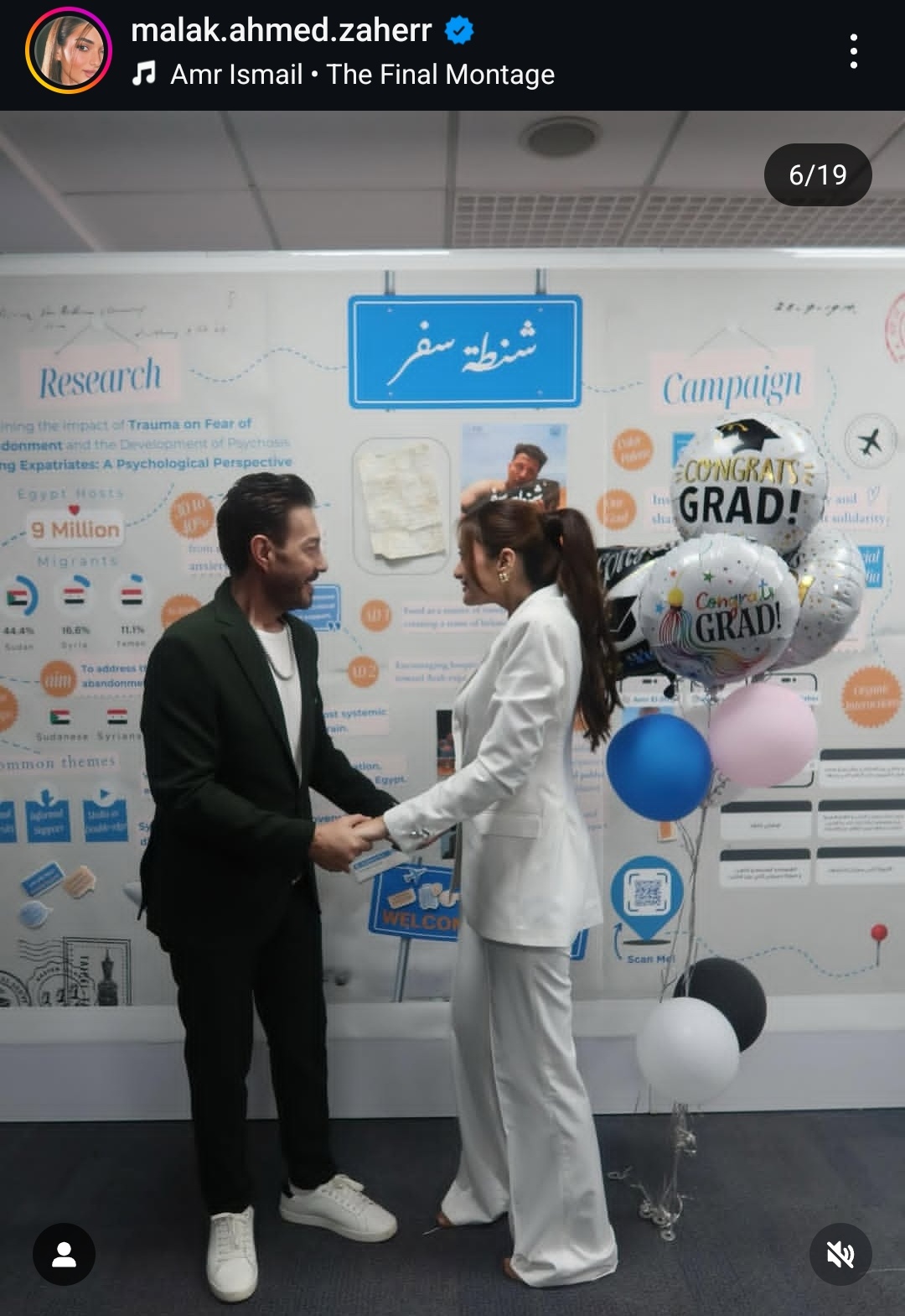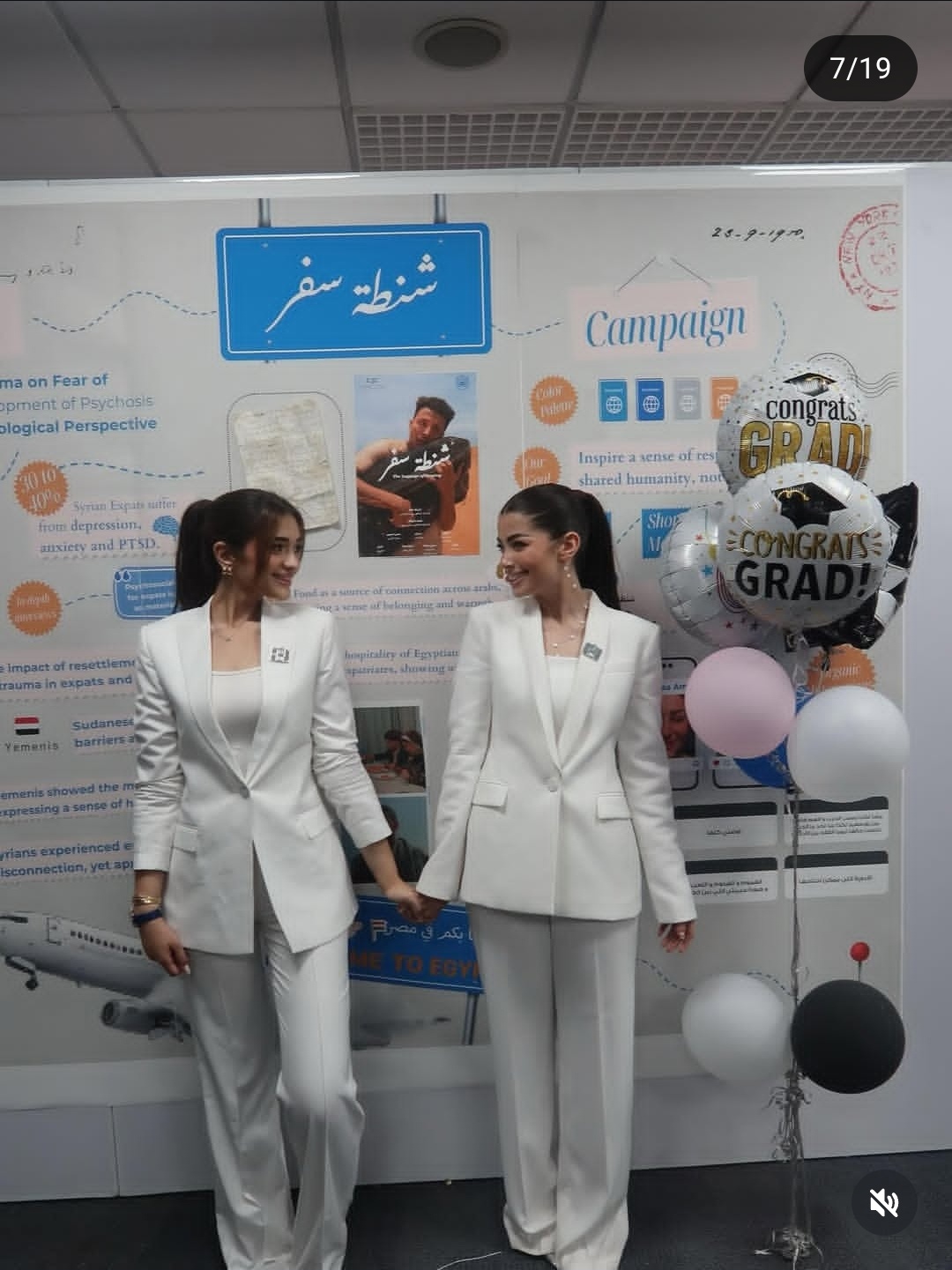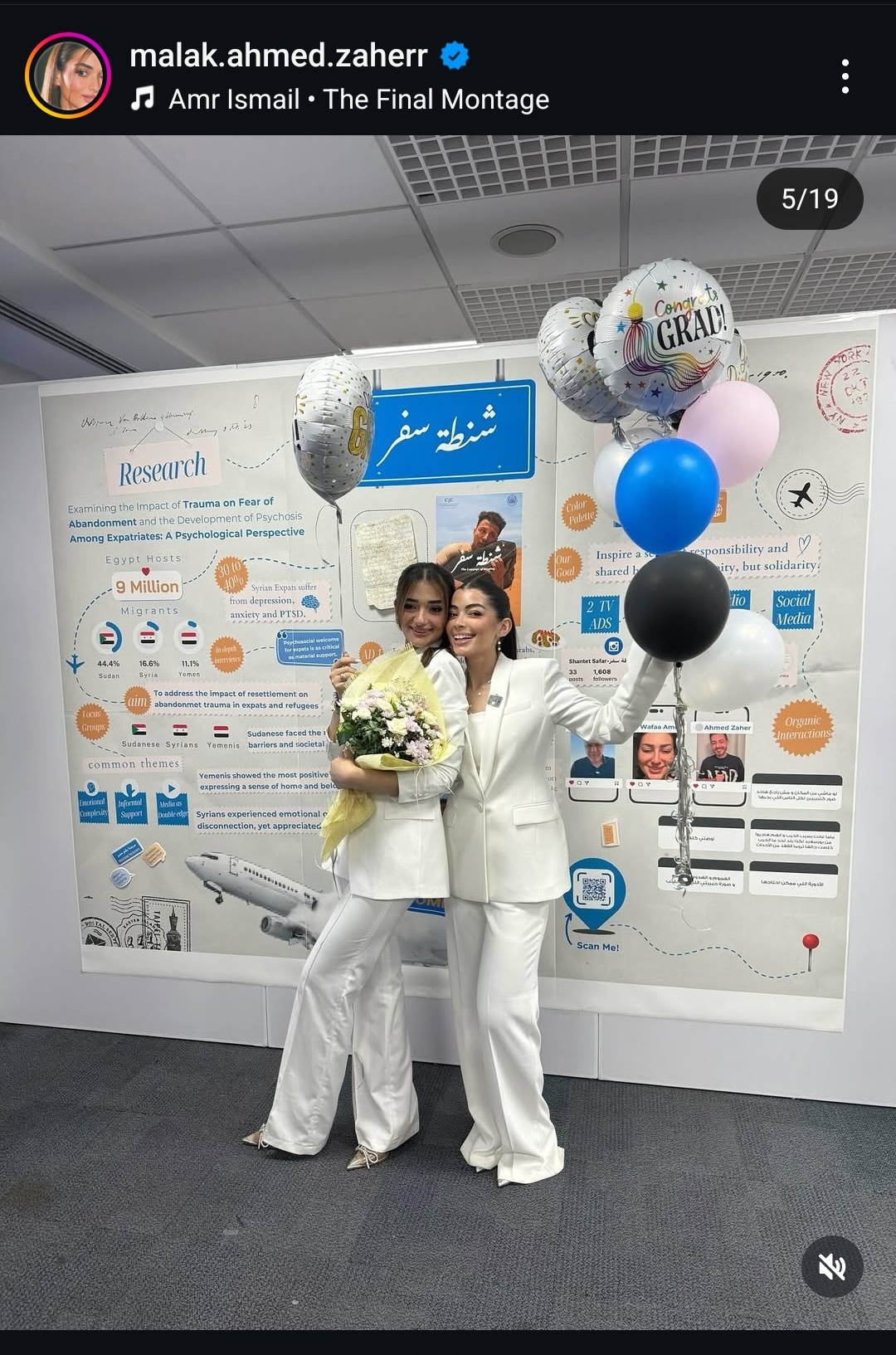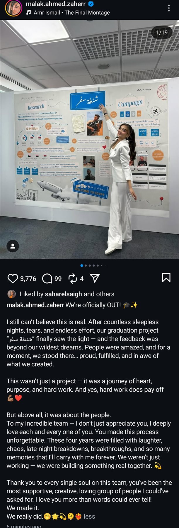 ونشرت مجموعة من الصور من حفلها على موقع التواصل الاجتماعي لتبادل الصور والفيديوهات الانستجرام، وكتبت: "لقد انتهينا رسميًا، ما زلتُ لا أصدق أن هذا حقيقي، بعد ليالٍ لا تُحصى من الأرق، ودموع، وجهدٍ لا يُحصى، رأى مشروع تخرجنا "شنطة سفر" النور أخيرًا - وكانت ردود الفعل تتجاوز كل توقعاتنا، انبهر الناس، وللحظة، وقفنا هناك... فخورين، راضين، ومعجبين بما أنجزناه".