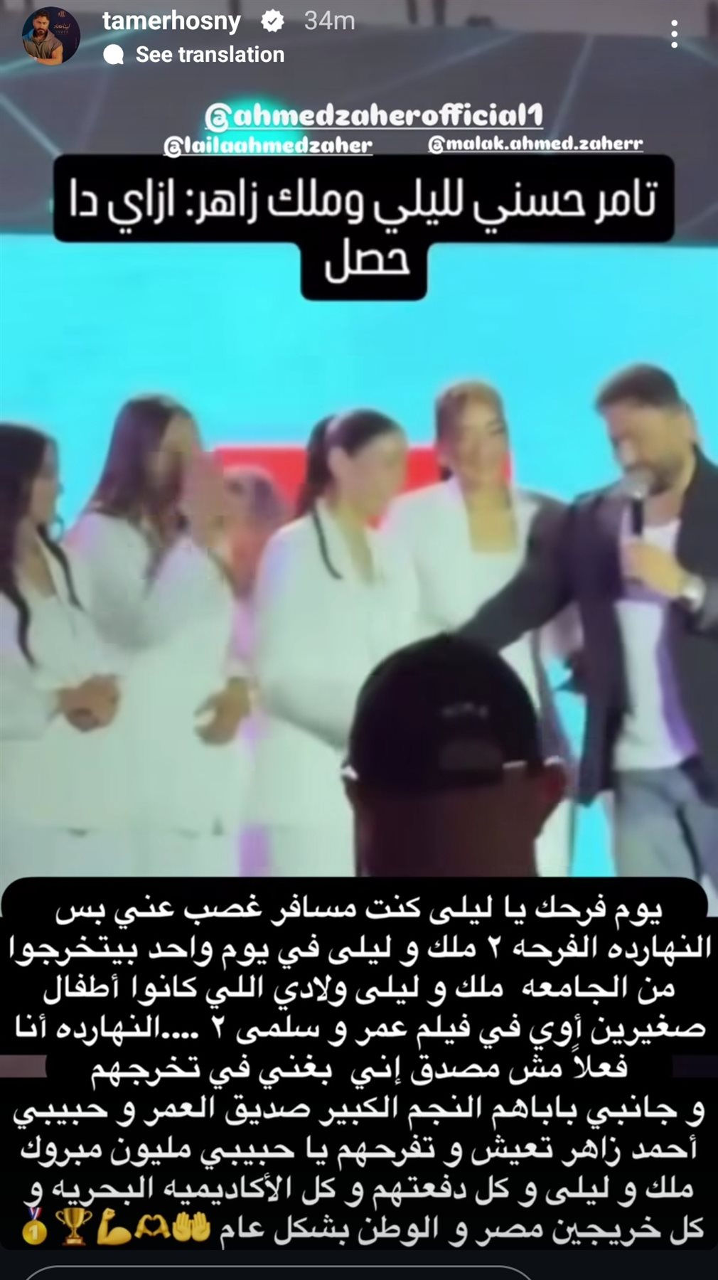 عبر الفنان تامر حسني عن سعادته بحضوره حفل مشروع تخرج ليلى وملك أحمد زاهر، موضحا سبب تغيبه عن فرح ليلى لسفره خارج البلاد، ولكنه قام بتعويض ذلك بمشاركتهم بفرحتهم بتخرجهم.