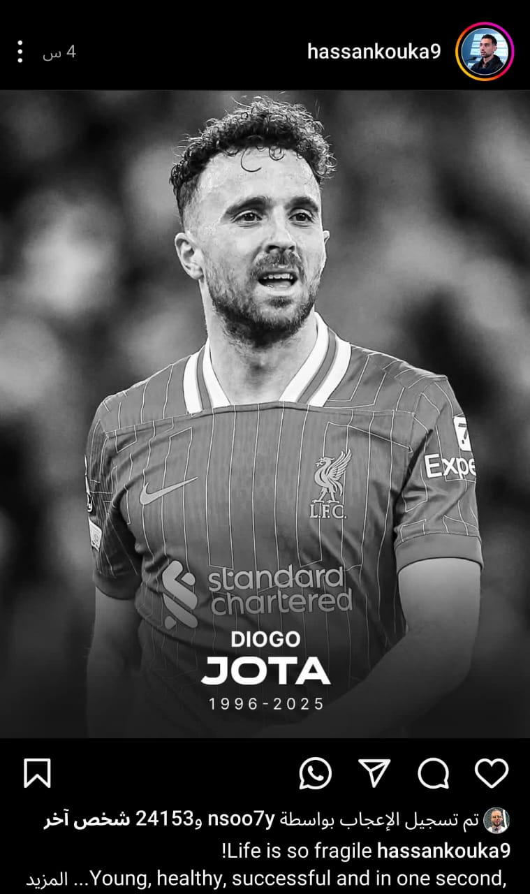 كوكا ينعى جوتا برسالة مؤثرة: "خالص التعازي لأخي محمد صلاح"