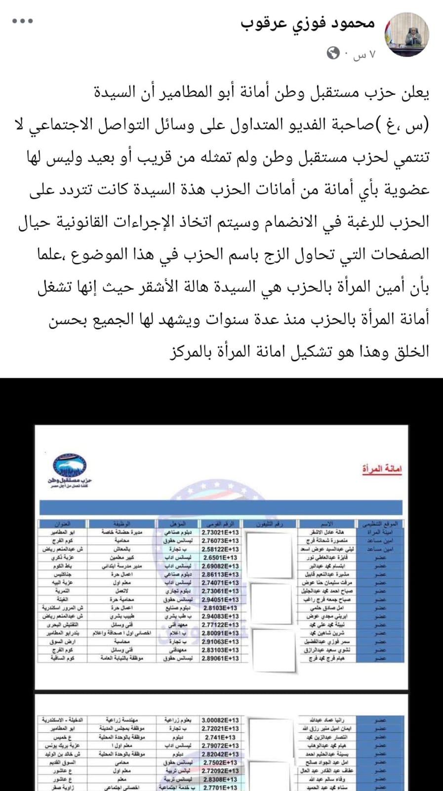 وفي هذا السياق، أصدرت أمانة حزب مستقبل وطن بمركز أبو المطامير بيانًا رسميًا، نفت فيه بشكل قاطع أي علاقة تربط الحزب بالسيدة صاحبة الفيديو المتداول، والتي عُرفت باسم "س.غ"، مؤكدة أنها ليست من أعضاء الحزب ولا تنتمي إليه من قريب أو بعيد.