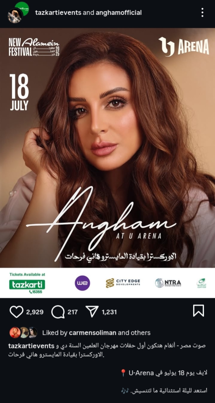 ومن المقرر أن تفتتح أنغام النسخة الثالثة من مهرجان العلمين، وستقام الحفل يوم الجمعه الموافق 18 يوليو من الشهر الجاري، بقيادة المايسترو هاني فرحات، على مسرح يو أرينا.