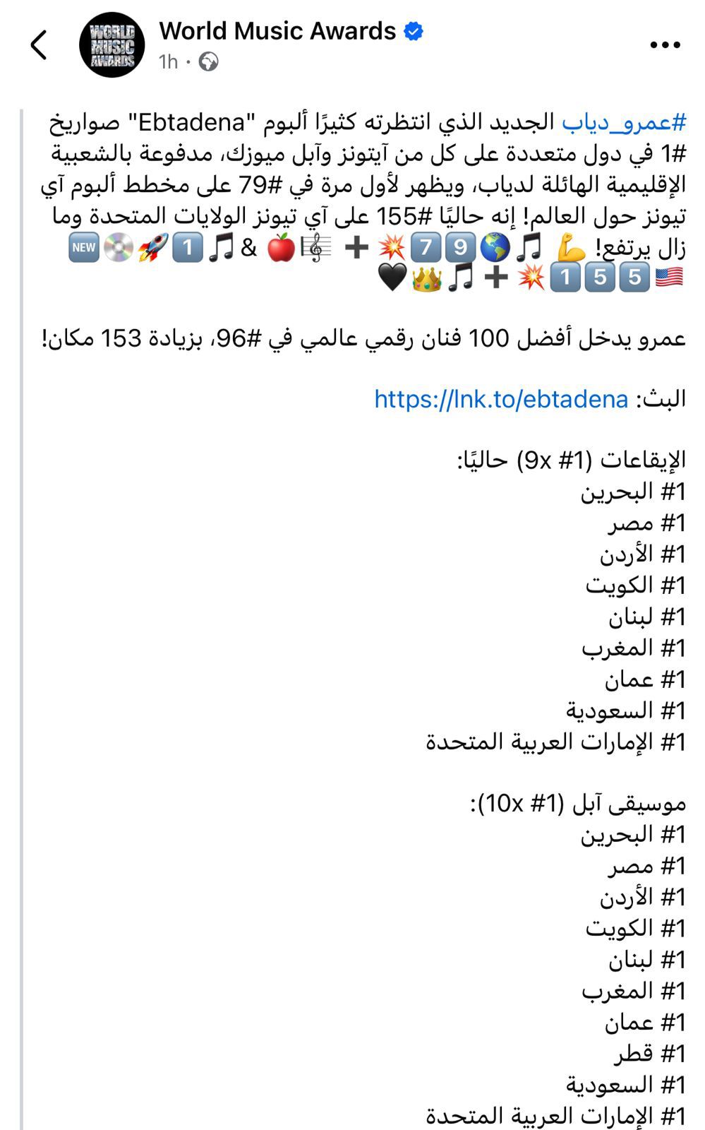 وكتبت ورلد ميوزك أورد عبر صفحتها على فيسبوك: "ألبوم عمرو دياب الجديد ابتدينا انتظره الكثير من الجمهور واحتل المركز الأول في دول متعددة على كل من آيتونز وآبل ميوزك، بسبب الشعبة الإقليمية الهائلة للهضبة".
