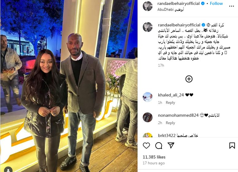 ونشرت راندا صورة تجمعها باللاعب عبر صفحتها الرسمية "إنستجرام" وكتبت "كرة القدم زعلانه.. بطل القصة .. الساحر الأباتشي شيكابالا. هتوحش ملاعبنا اوي ".