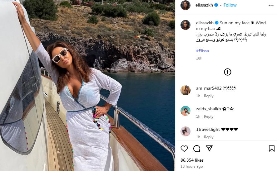 شاركت النجمة اللبنانية إليسا متابعيها أحدث ظهور لها خلال قضاء عطلتها الصيفية على متن يخت مرتدية ملابس البحر حيث أشاد متابعيها بإطلالتها .