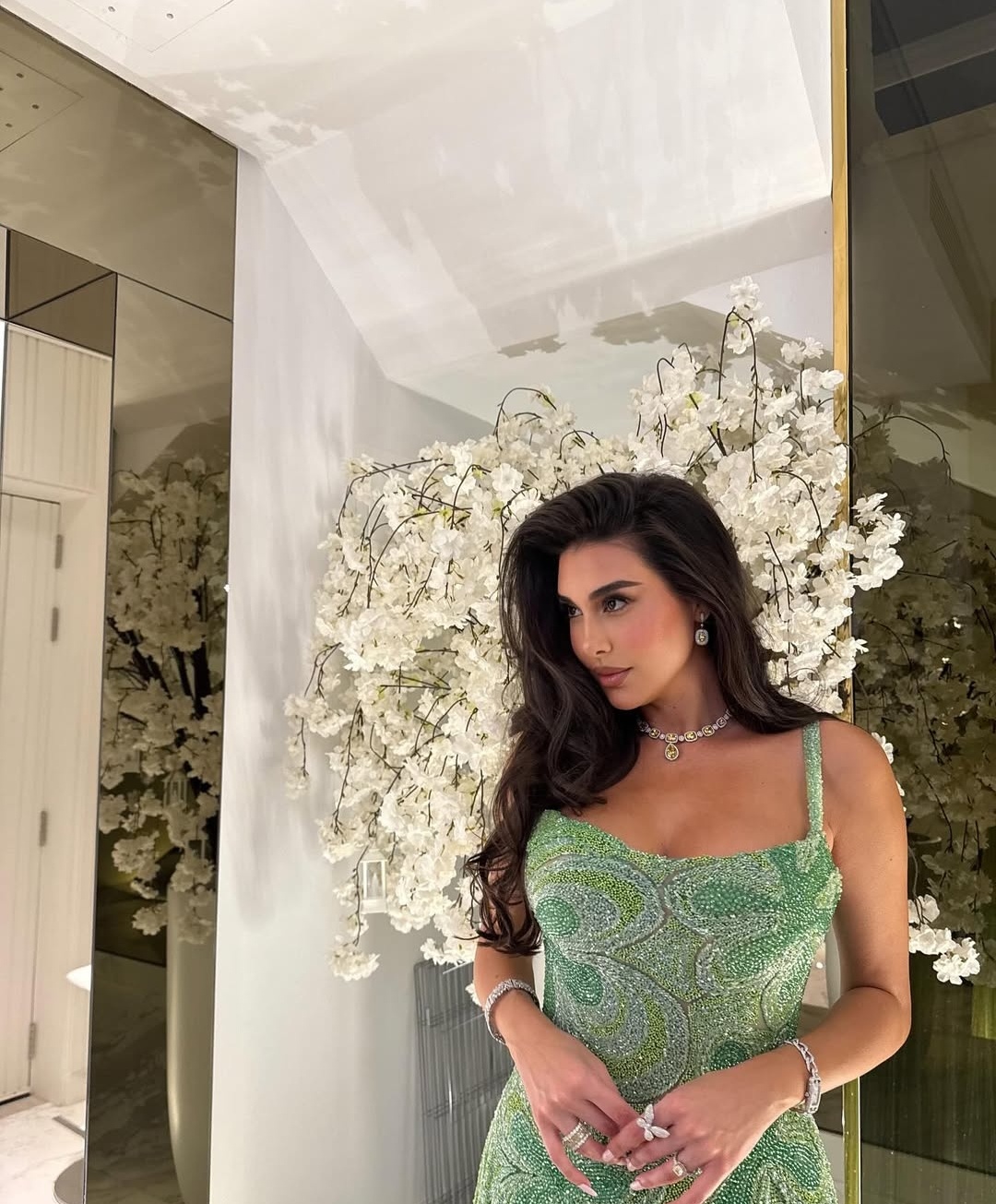 كما ارتدت بعض المجوهرات الرقيقة، خواتم وأساور وعقد وقرط رقيق.