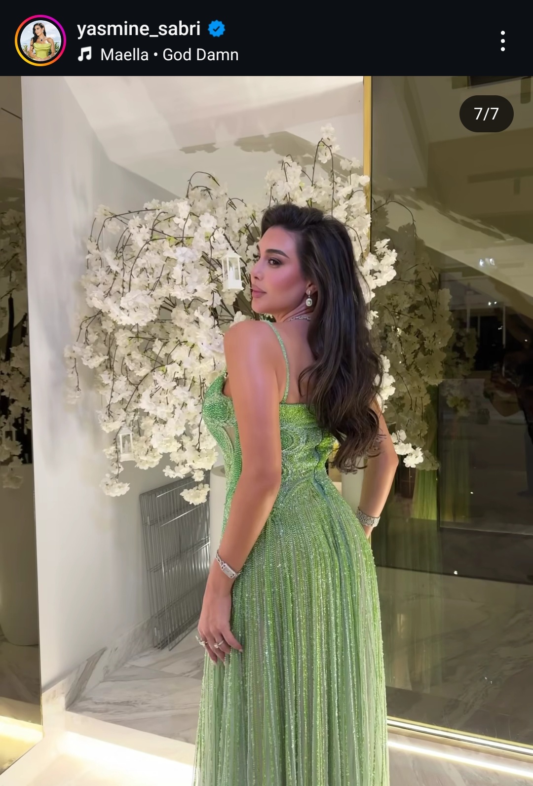 وخطفت ياسمين صبري، الأنظار لها بإطلالة أنيقة، ارتدت فستان مجسم لامع باللون الاخضر واضعه بعض من مساحيق التجميل البسيطة لتبرز جمال ملامحها.