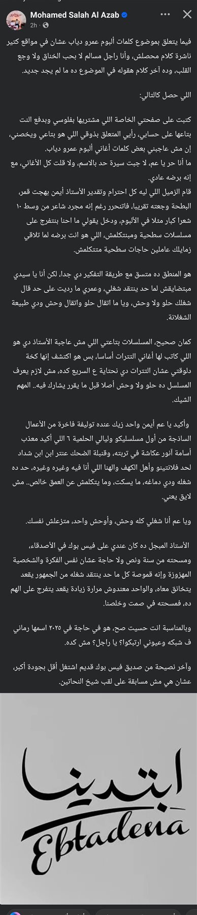 وقال العزب في منشور نشره عبر صفحته الخاصة على موقع "فيس بوك": “فيما يتعلق بموضوع كلمات ألبوم عمرو دياب عشان في مواقع كتير ناشرة كلام محصلش، وأنا راجل مسالم لا بحب الخناق ولا وجع القلب، وده آخر كلام هقوله في الموضوع ده ما لم يجد جديد”.