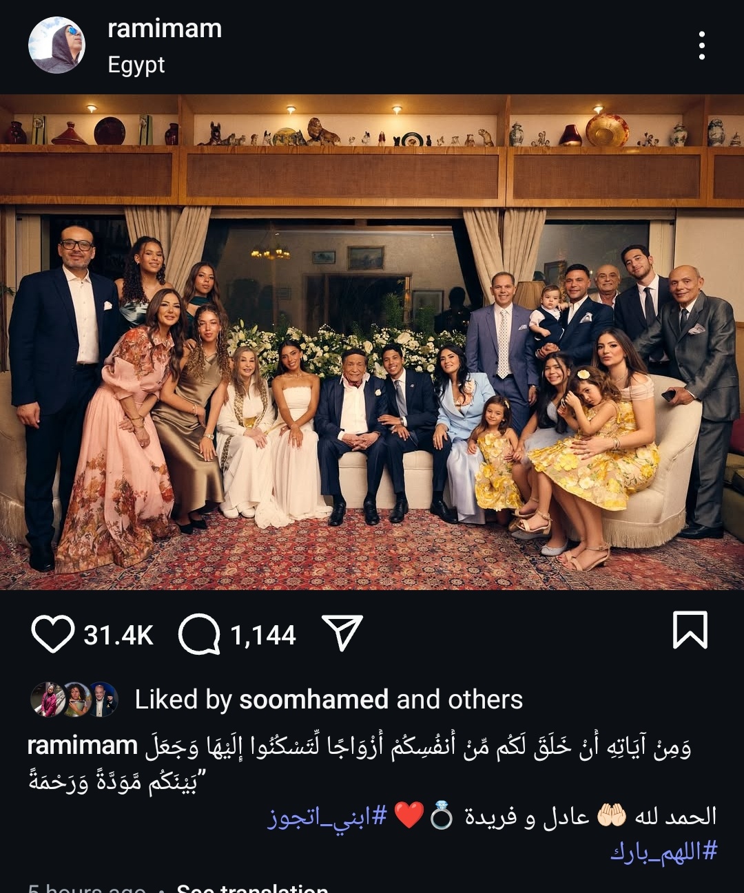 أشعل الفنان محمد إمام والمخرج رامي إمام مواقع التواصل الاجتماعي بعد نشرهما صورة عائلية تجمع والدهما الزعيم عادل إمام مع الأسرة، موضحا أنها من كتب كتاب حفيد الزعيم عادل إمام، في ظهور نادر له لاقى تفاعلا واسعًا بين محبيه.